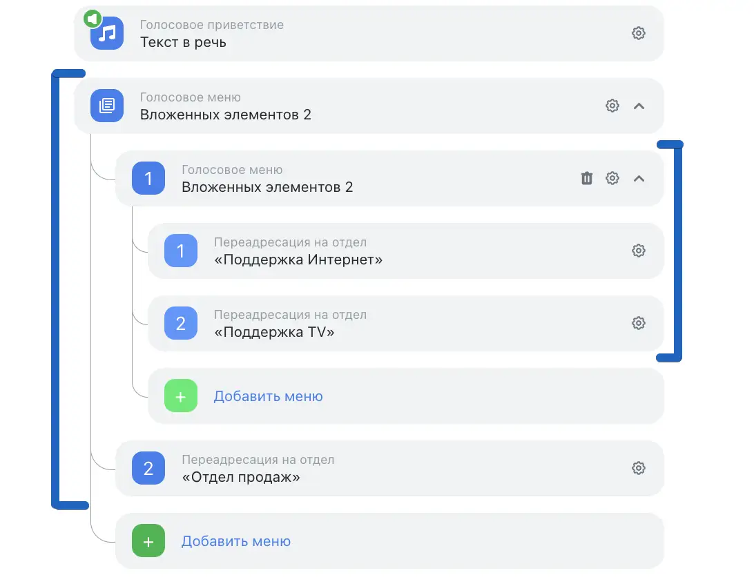 Рассмотрим следующий пример. В компании два отдела поддержки клиентов — поддержка услуг интернета и поддержка TV, а также есть отдел продаж. В этом случае сначала нужно дать клиенту возможность выбрать между отделом поддержки и отделом продаж, а затем, при выборе отдела поддержки, предложить выбрать конкретное подразделение.