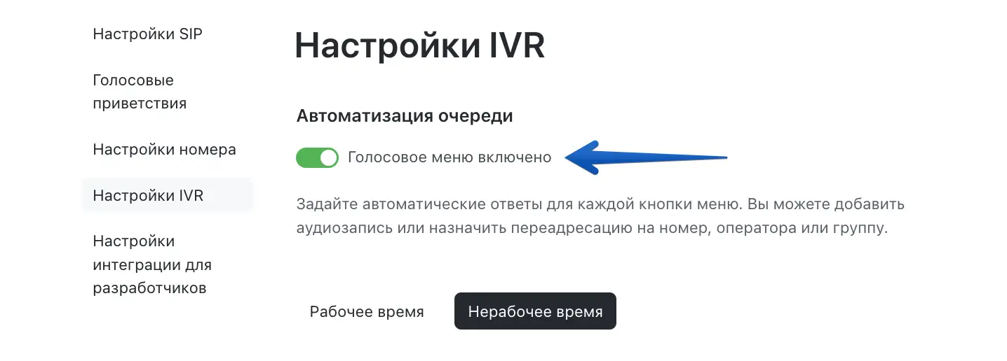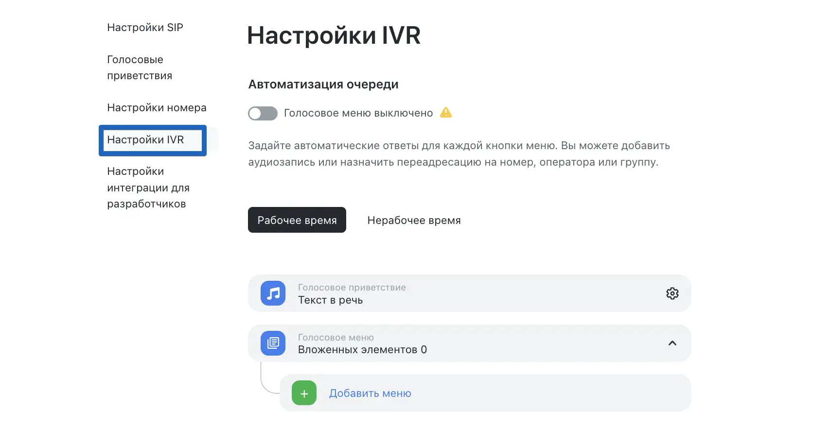 Для этого перейдите в "Управление" > "Каналы связи" > "Настроить" (рядом с каналом вашего номера), затем откройте раздел "Настройки IVR".