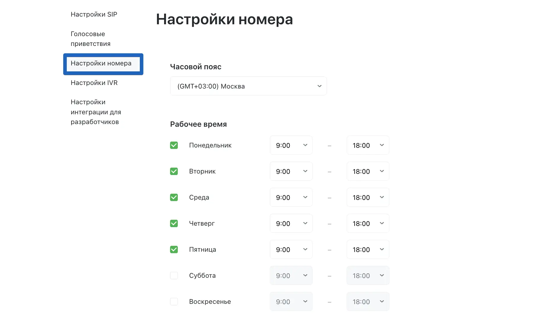 Настройки здесь разделены на две вкладки: "Рабочее время" и "Нерабочее время". Настроить график рабочего времени можно в соседнем разделе — "Настройки номера".