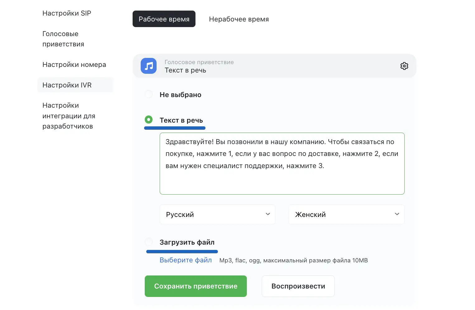 Голосовое меню для нерабочего времени настраивается по тому же принципу.