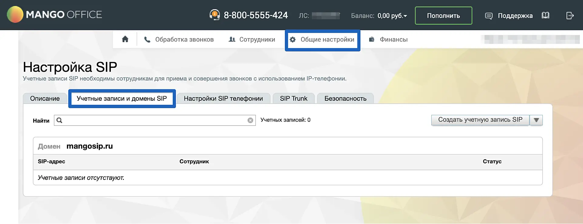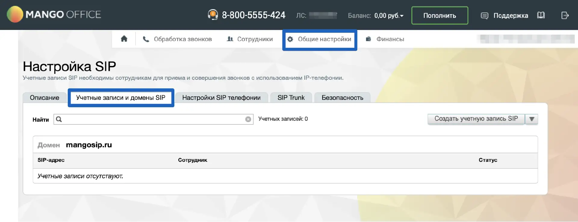 1. Зайдите в личный кабинет Манго, перейдите в раздел "Общие настройки" -> "Настройка SIP" -> "Учетные записи и домены SIP":
