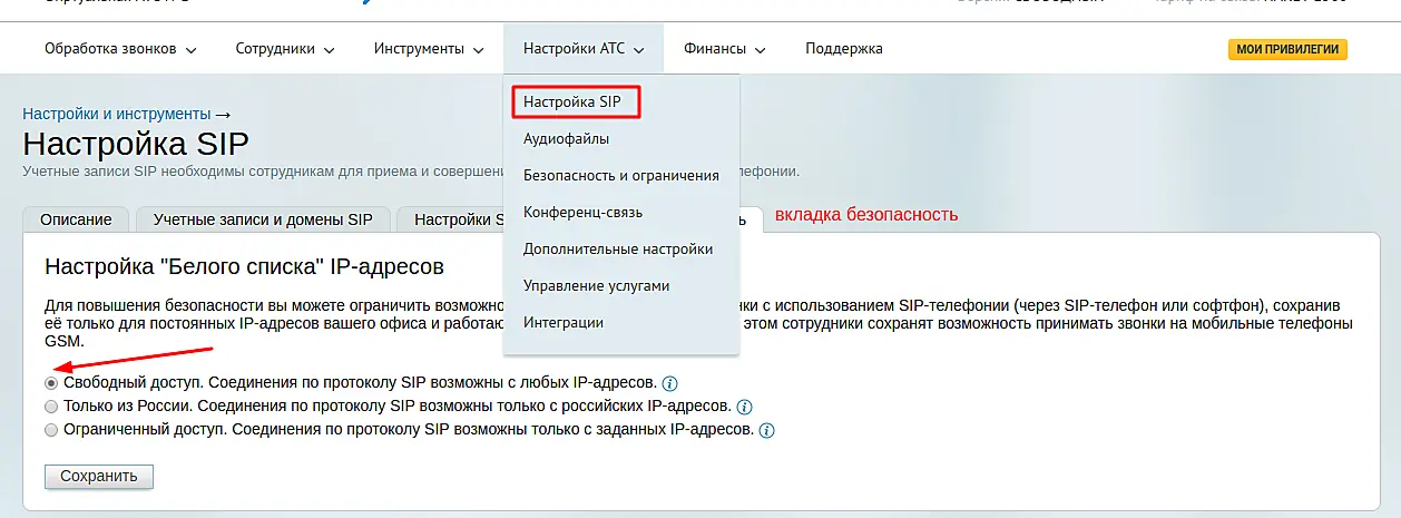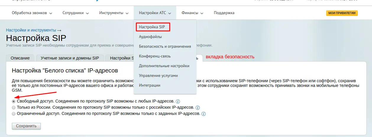 4. Убедитесь, что в настройках SIP во вкладке "Безопасность" выбран пункт "Свободный доступ":