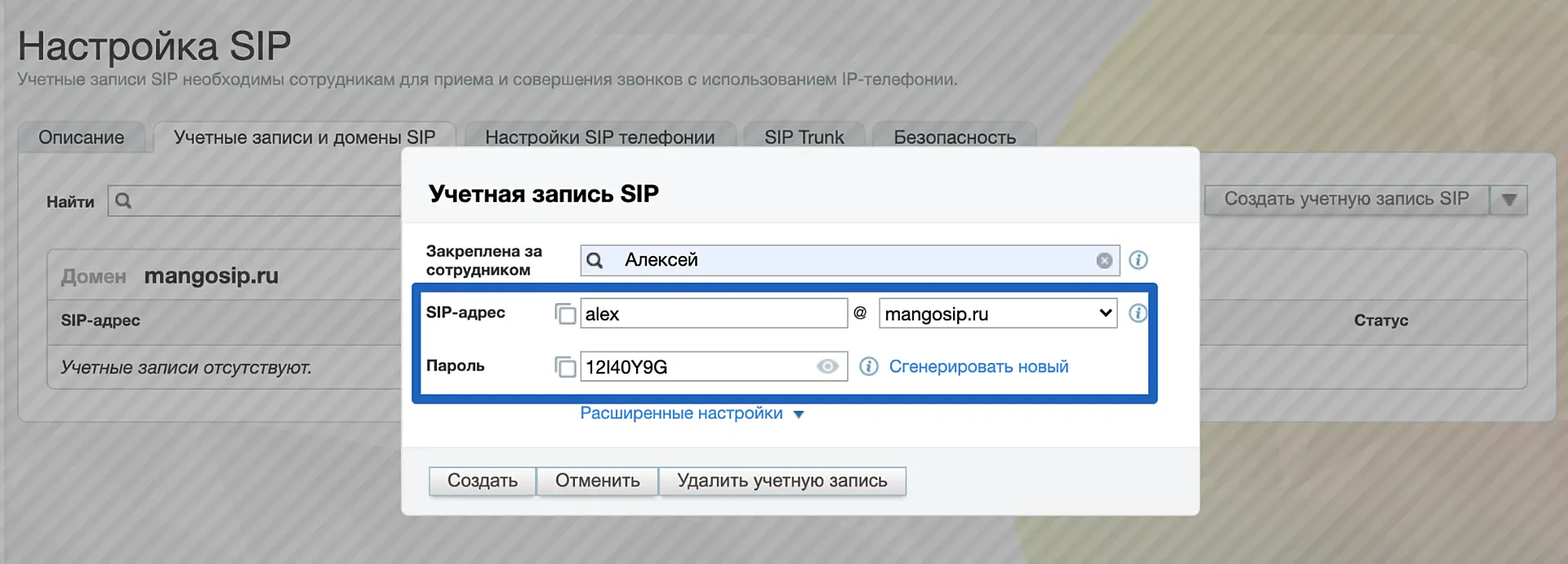 - SIP логин (в Манго - SIP адрес, до символа "@") и пароль