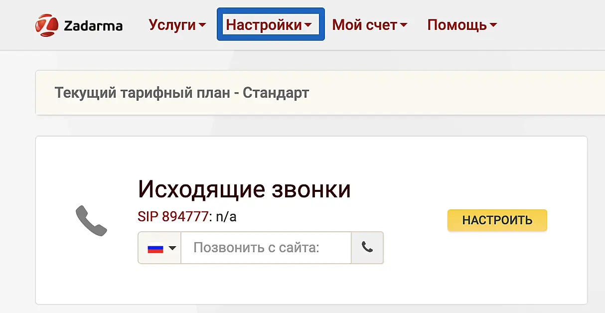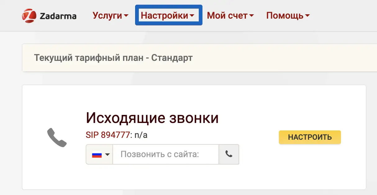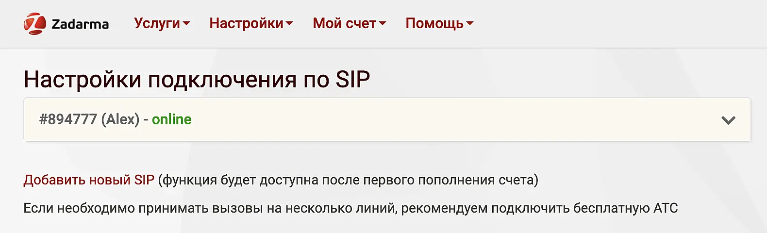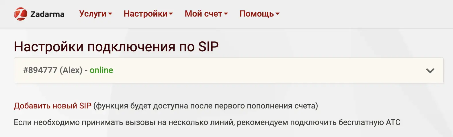 1. Зайдите в личный кабинет Zadarma, перейдите в раздел "Настройки" -> "Подключение по SIP":
