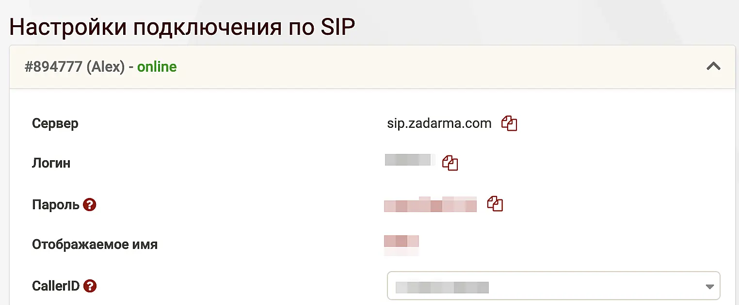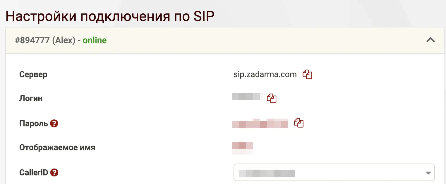 3. Скопируйте из личного кабинета в Zadarma и вставьте в Jivo данные для подключения: