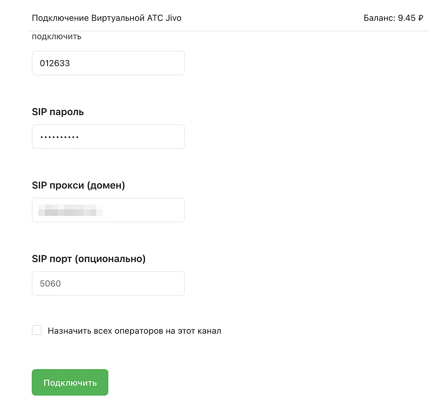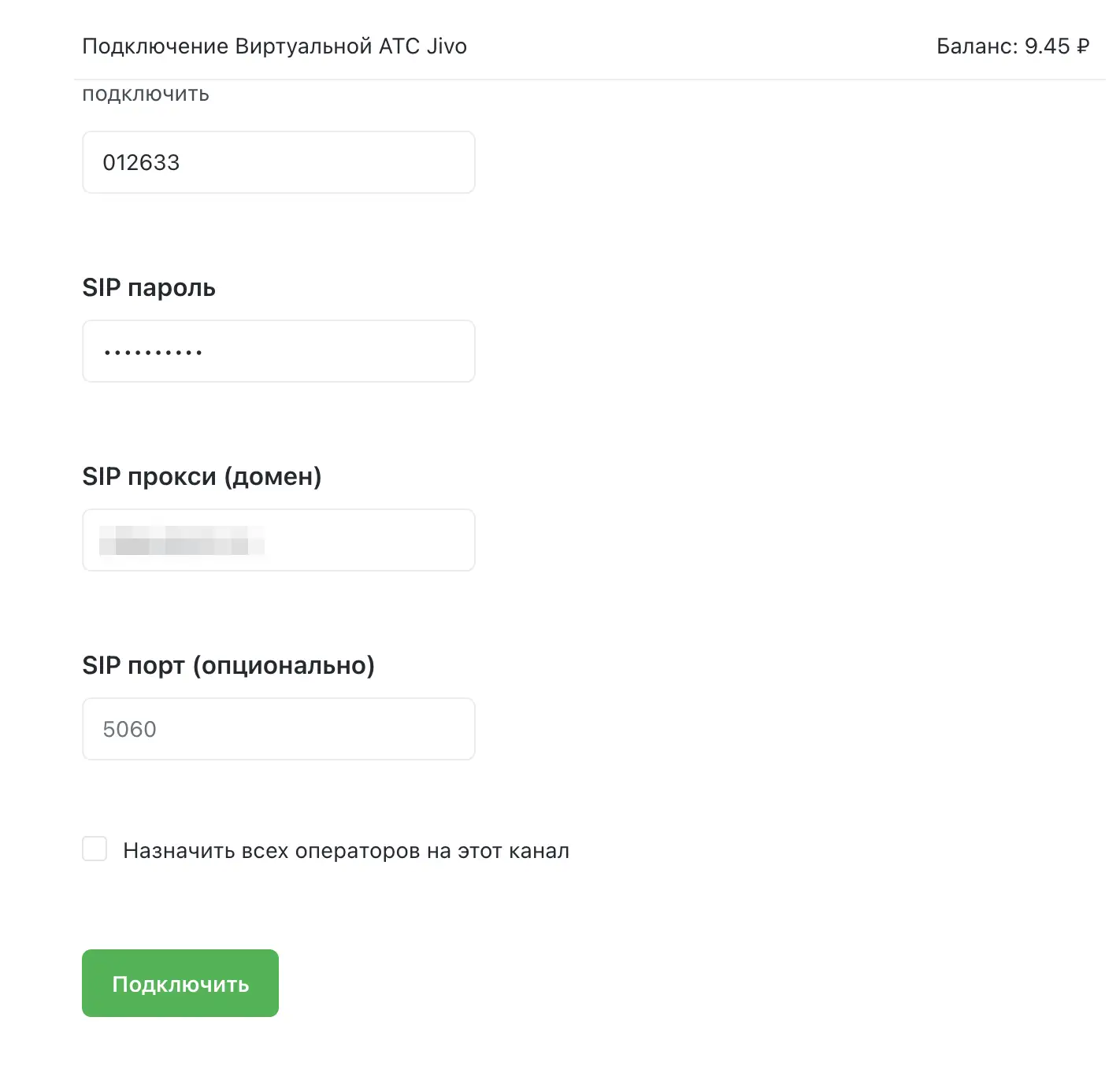 2. Скопируйте из письма и вставьте в Jivo данные для подключения номер телефона: