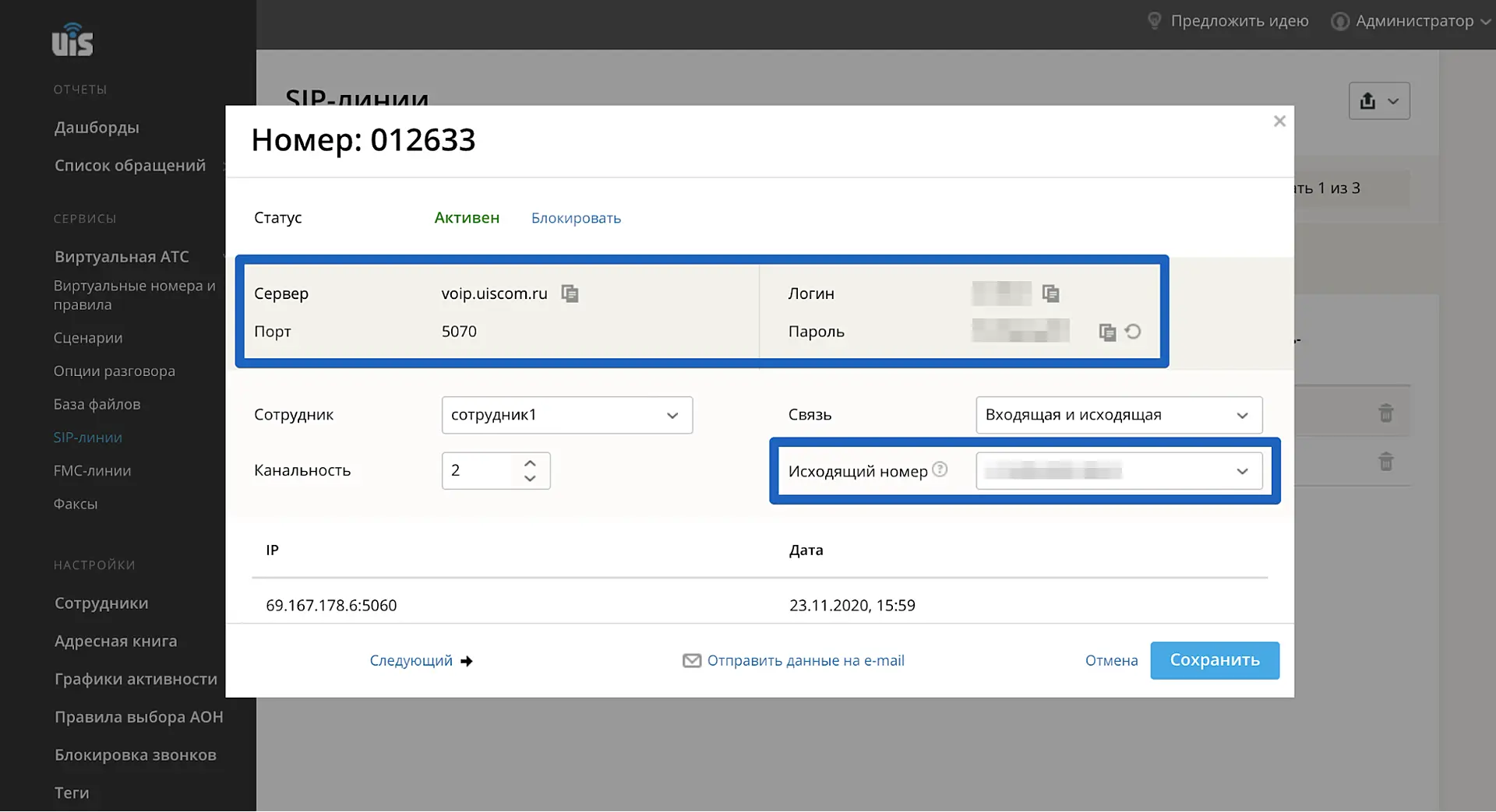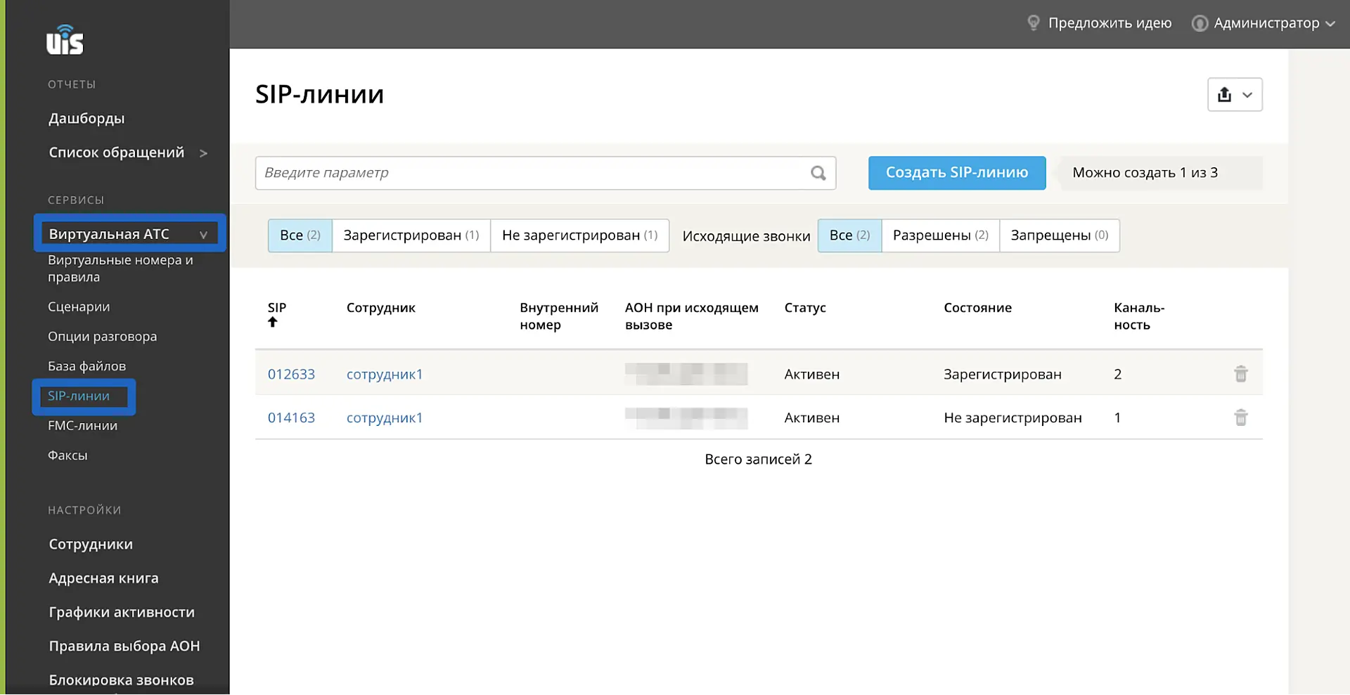 1. Зайдите в личный кабинет UIS, перейдите в раздел "Сервисы" -> "Виртуальная АТС" -> "SIP-линии":