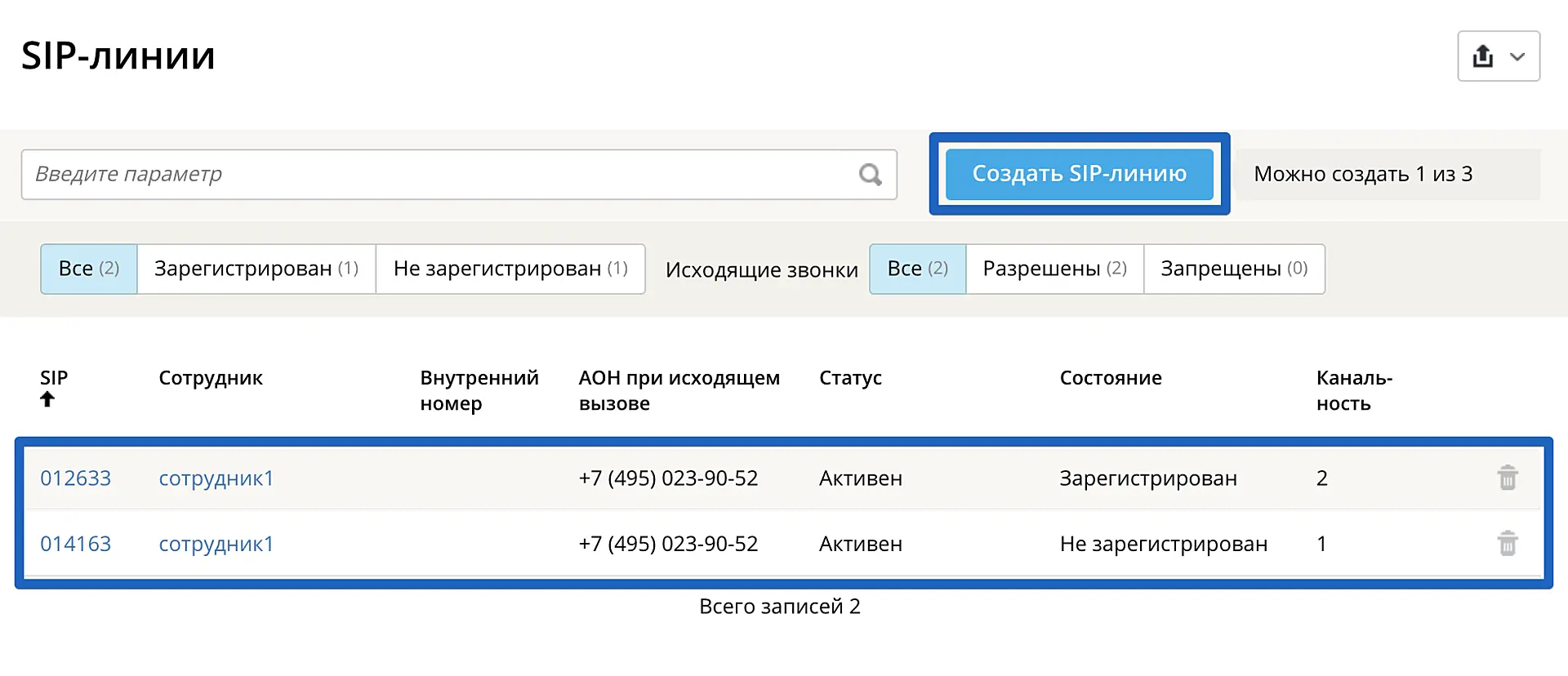 2. Выберите SIP линию из списка. Если список пуст, создайте новую:
