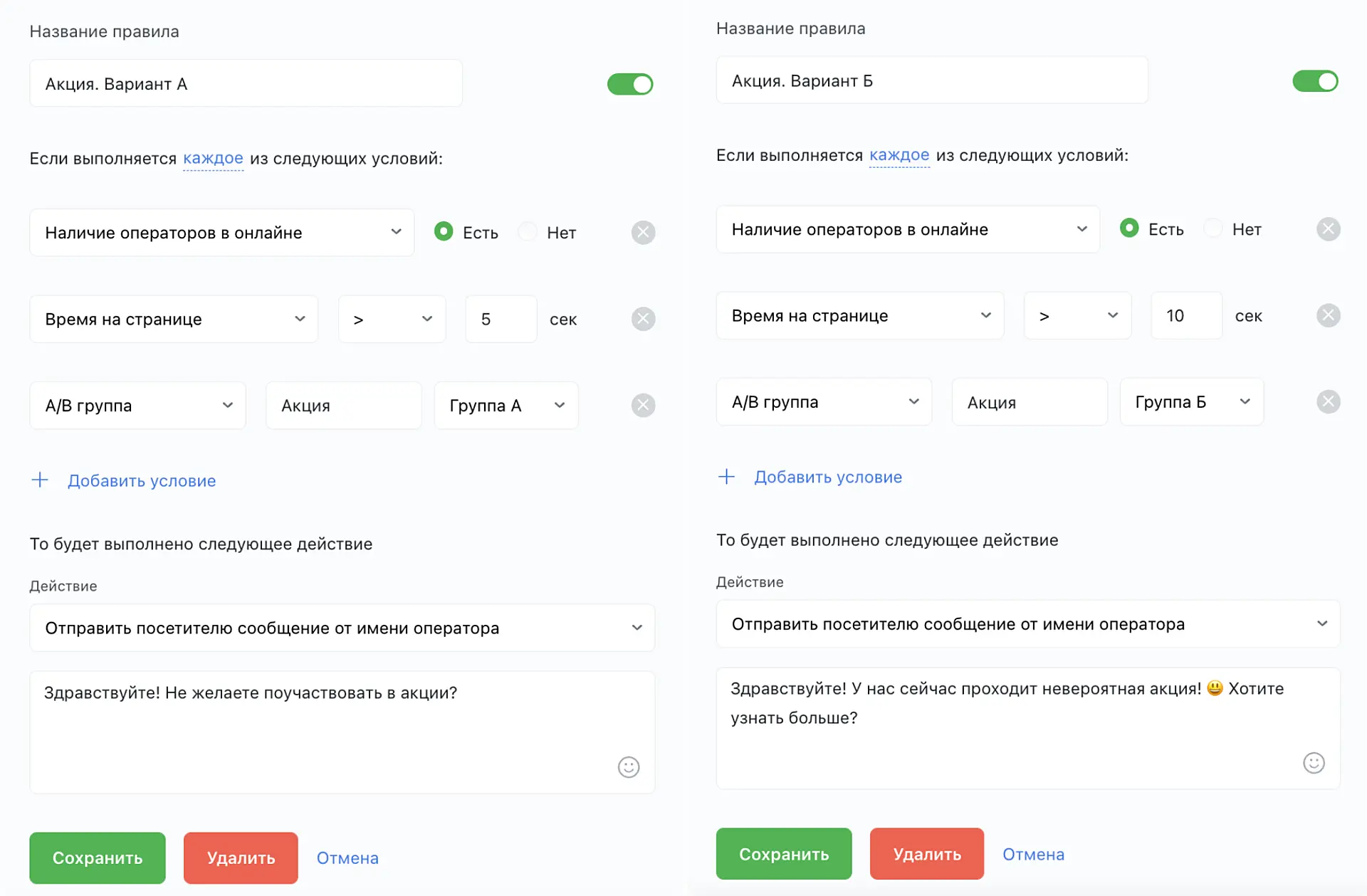 Создайте два действия с различными настройками/текстами и условием А/Б группа. В одном из действий установите в условии значение "группа А", в другом — "группа Б".