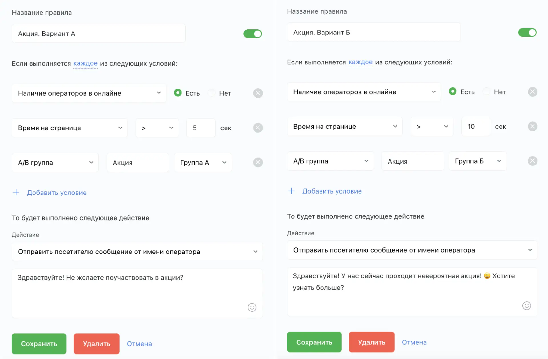 На этом настройка автоматических действий готова. Далее вы сможете отследить, при каком из сценариев посетители сайта чаще вступают в диалог, при помощи систем аналитики.