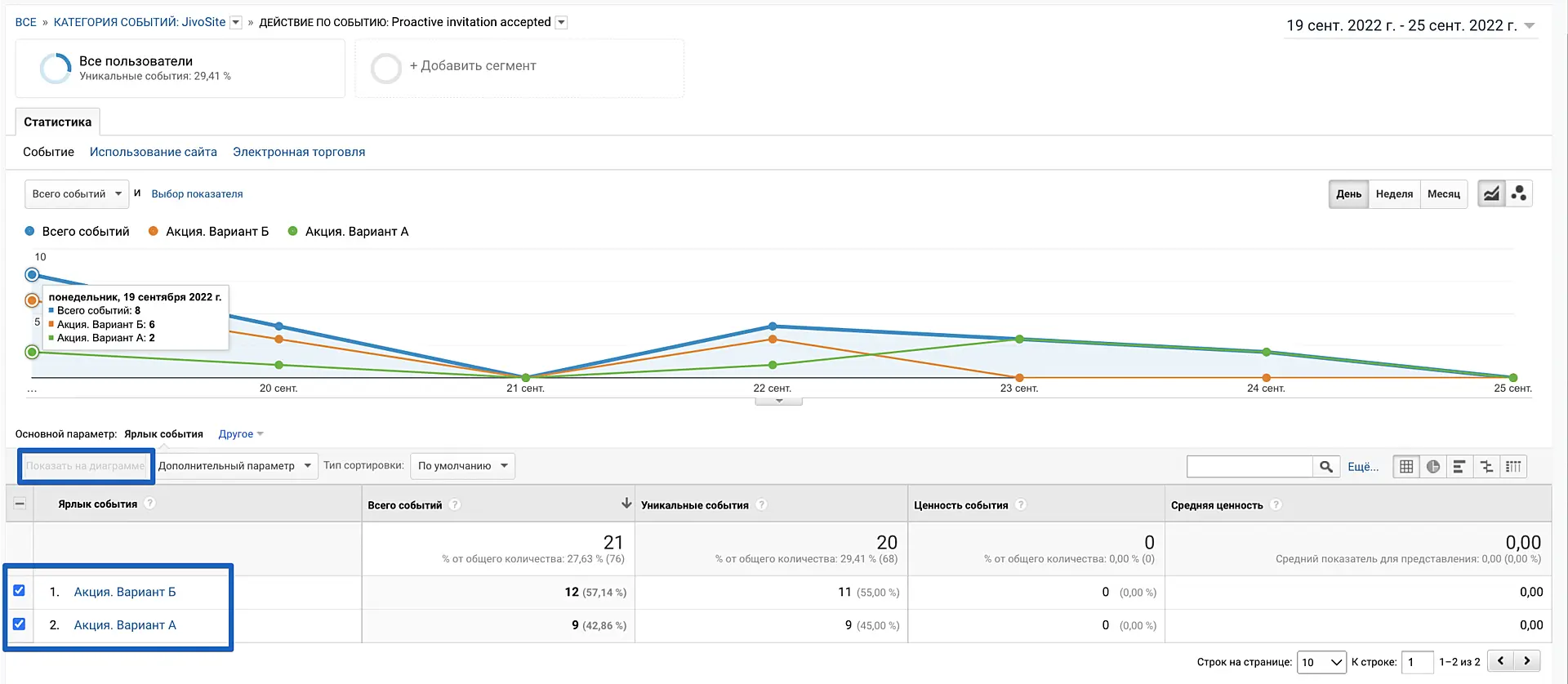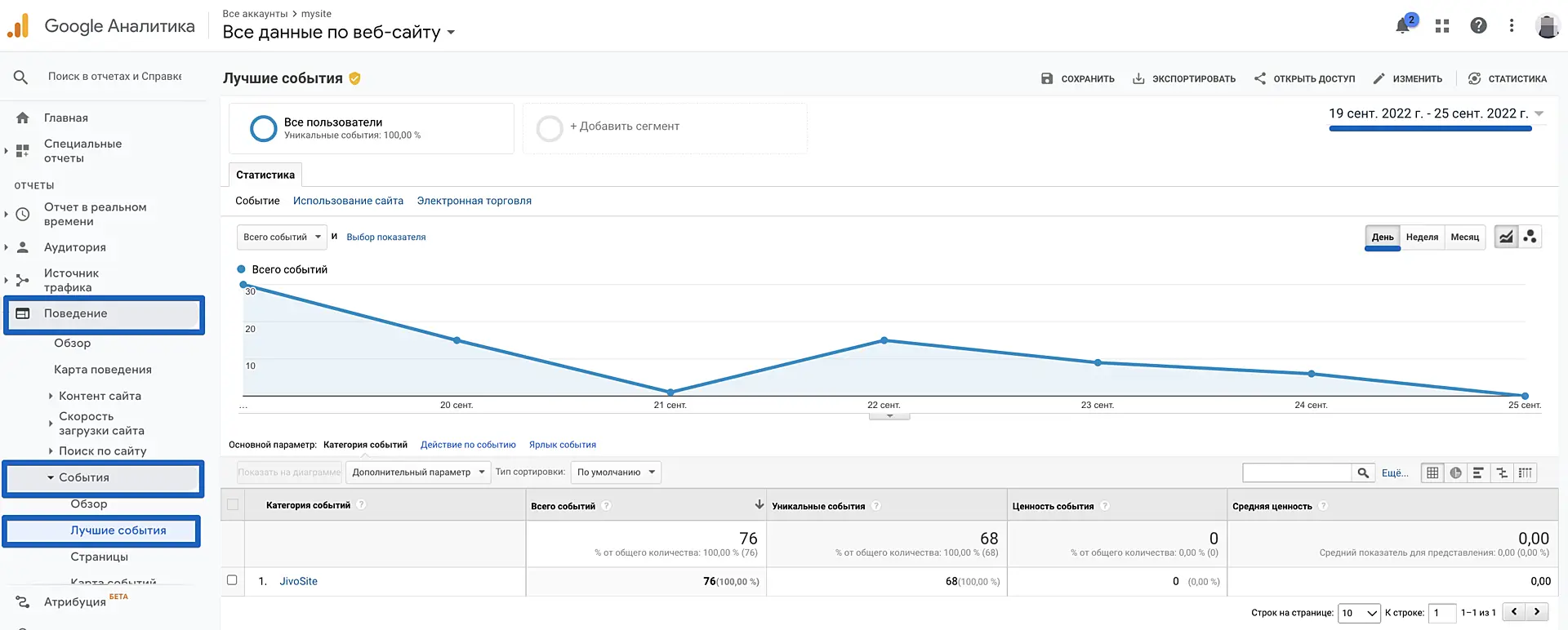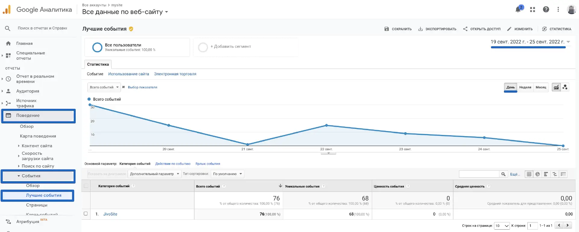 Для просмотра статистики по тестируемому действию в вашем кабинете Google Analytics перейдите в Поведение > События > Лучшие события.