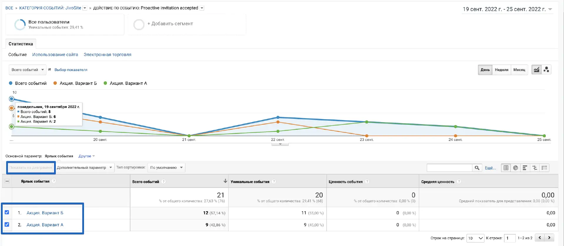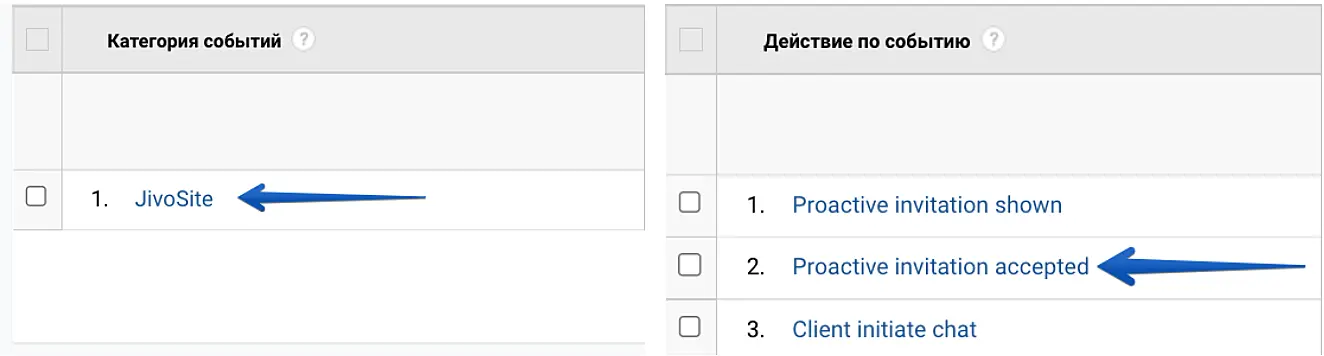 Далее в графе "Категория событий" нажмите на "JivoSite", а затем на "Proactive invitation accepted".