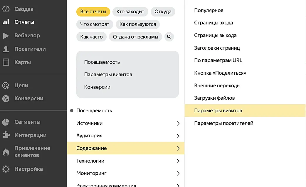 В Яндекс Метрику группы А и Б, а также названия тестов передаются через параметры визитов. Для просмотра статистики по ним перейдите в Отчёты > Содержание > Параметры визитов.