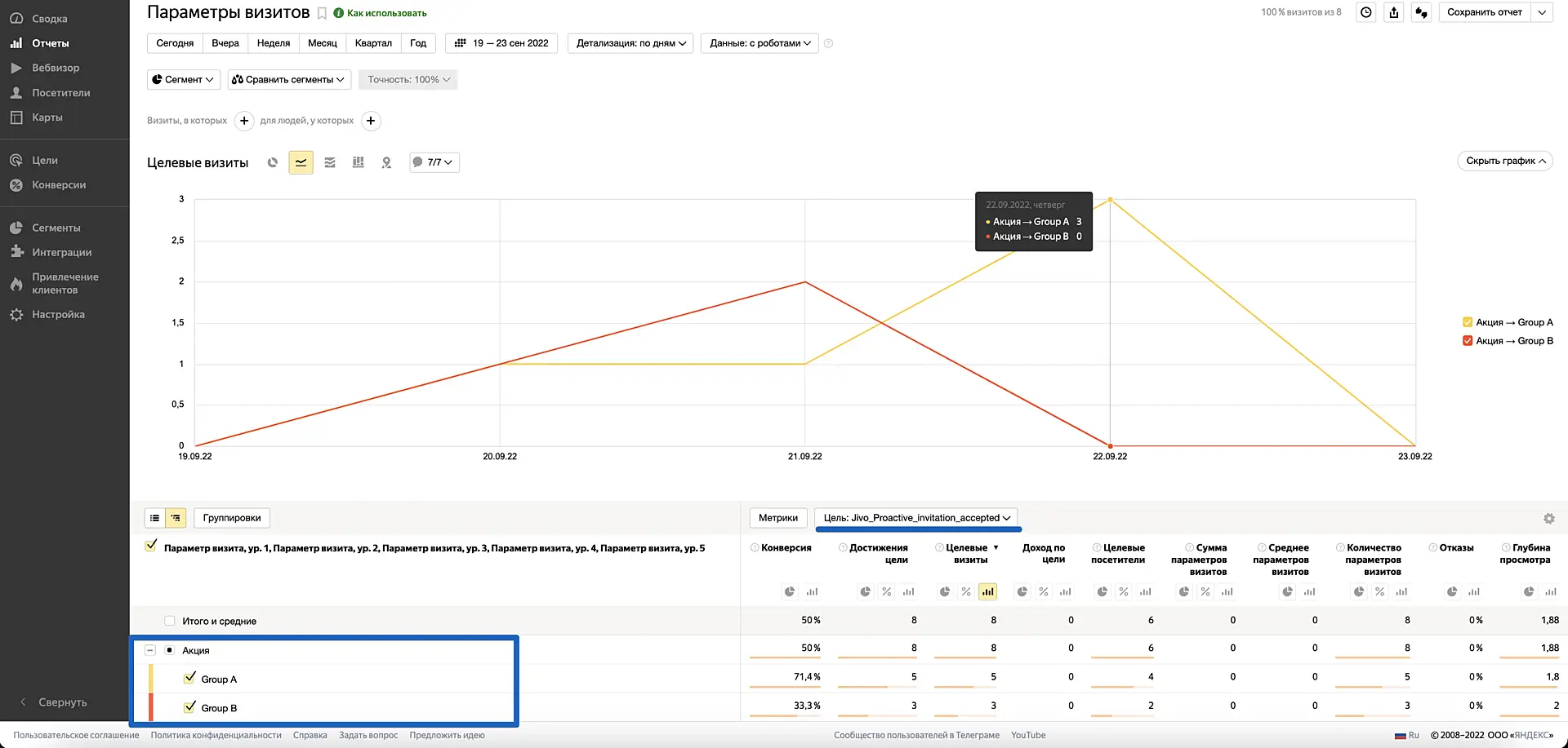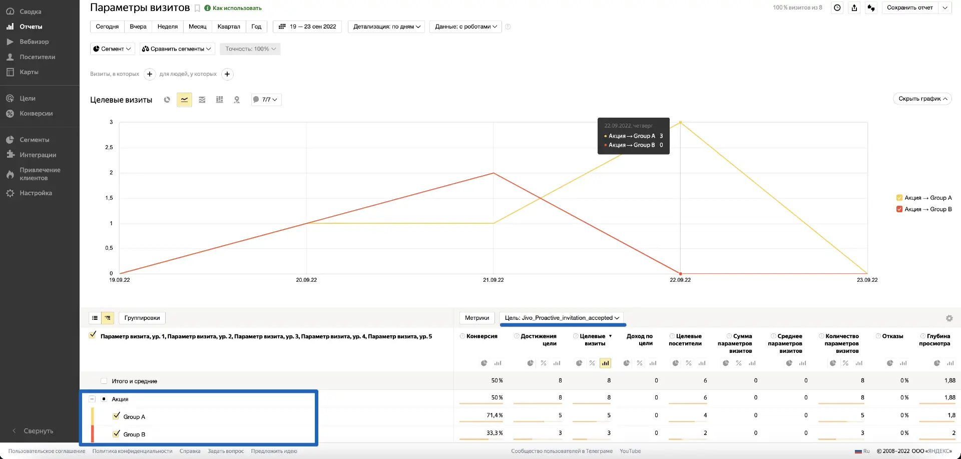 Здесь выберите нужную цель и отметьте галочками Group A и Group B. Результат будет наглядно представлен на графике.