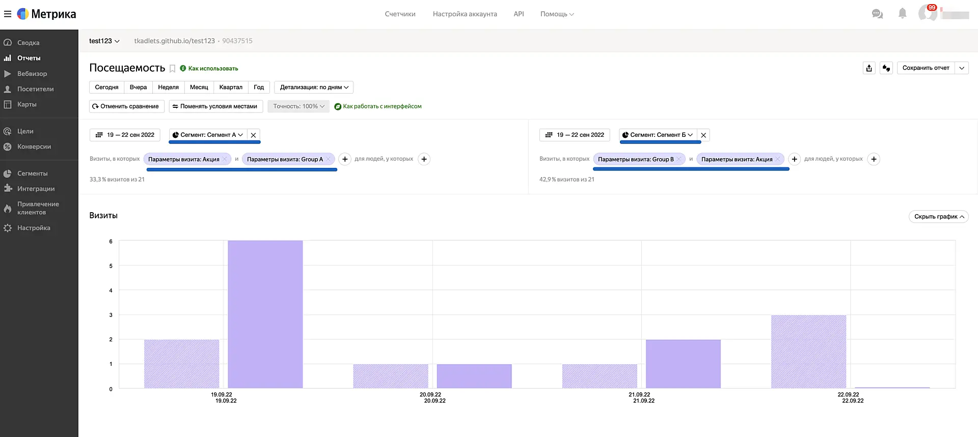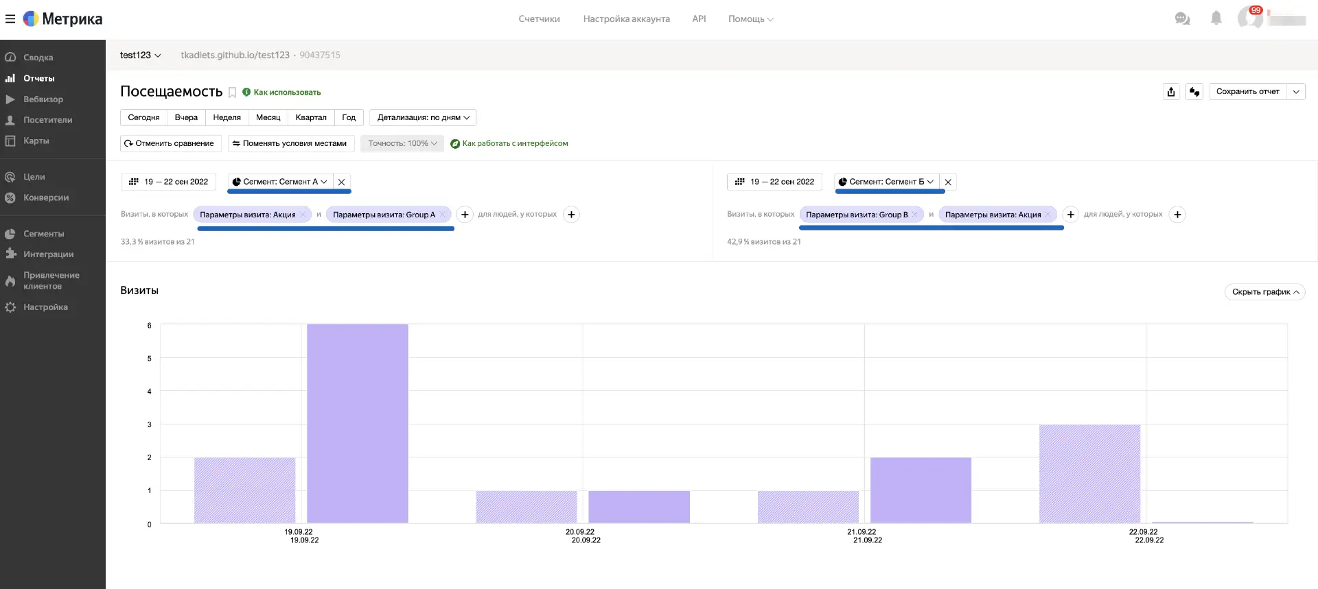 Также вы можете сохранить каждый из двух сегментов, чтобы сравнить их в отчёте "Посещаемость".