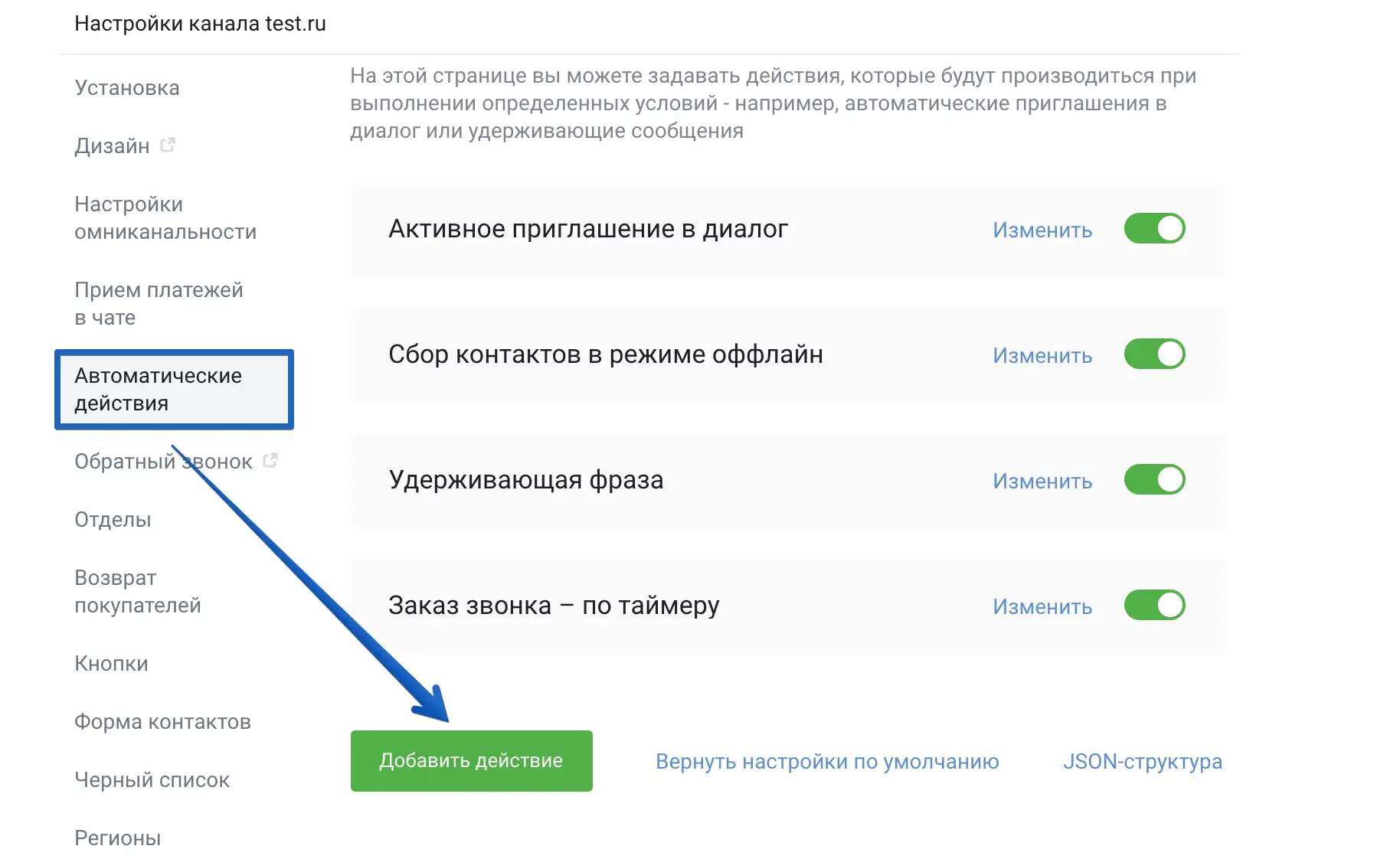 Для начала вам нужно зайти в приложение Jivo, затем перейти в раздел "Управление" > "Каналы связи" > "Настройки" (нужного сайта) > "Автоматические действия".