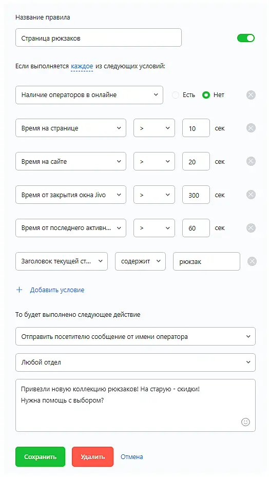 Предугадывайте потребности и удивляйте посетителей - при индивидуальном подходе вступит в диалог гораздо большее количество посетителей, чем только при одной стандартной фразе "Здравствуйте! Я могу вам чем-то помочь?". Просто настройте действие с условием "URL текущей страницы содержит ..." и используйте в этом условии слово из вашей кампании.