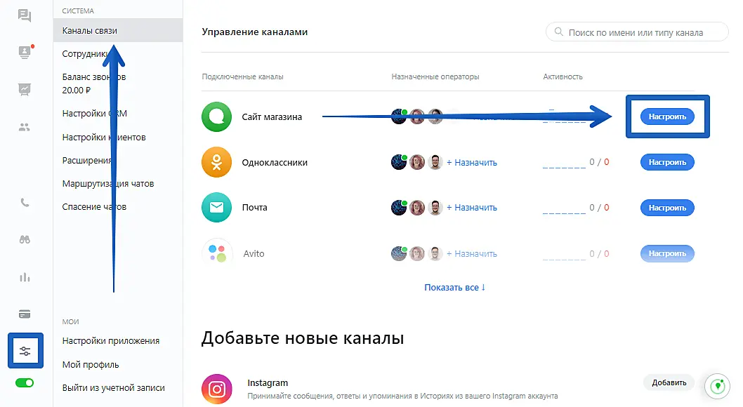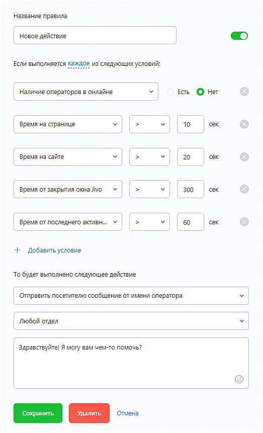 Jivo предлагает довольно широкие возможности для настроек всплывания окна чата. Данные настройки производятся в нашем приложении, где нужно перейти в Управление -> Каналы связи -> Настройки (нужного сайта) -> Автоматические действия.