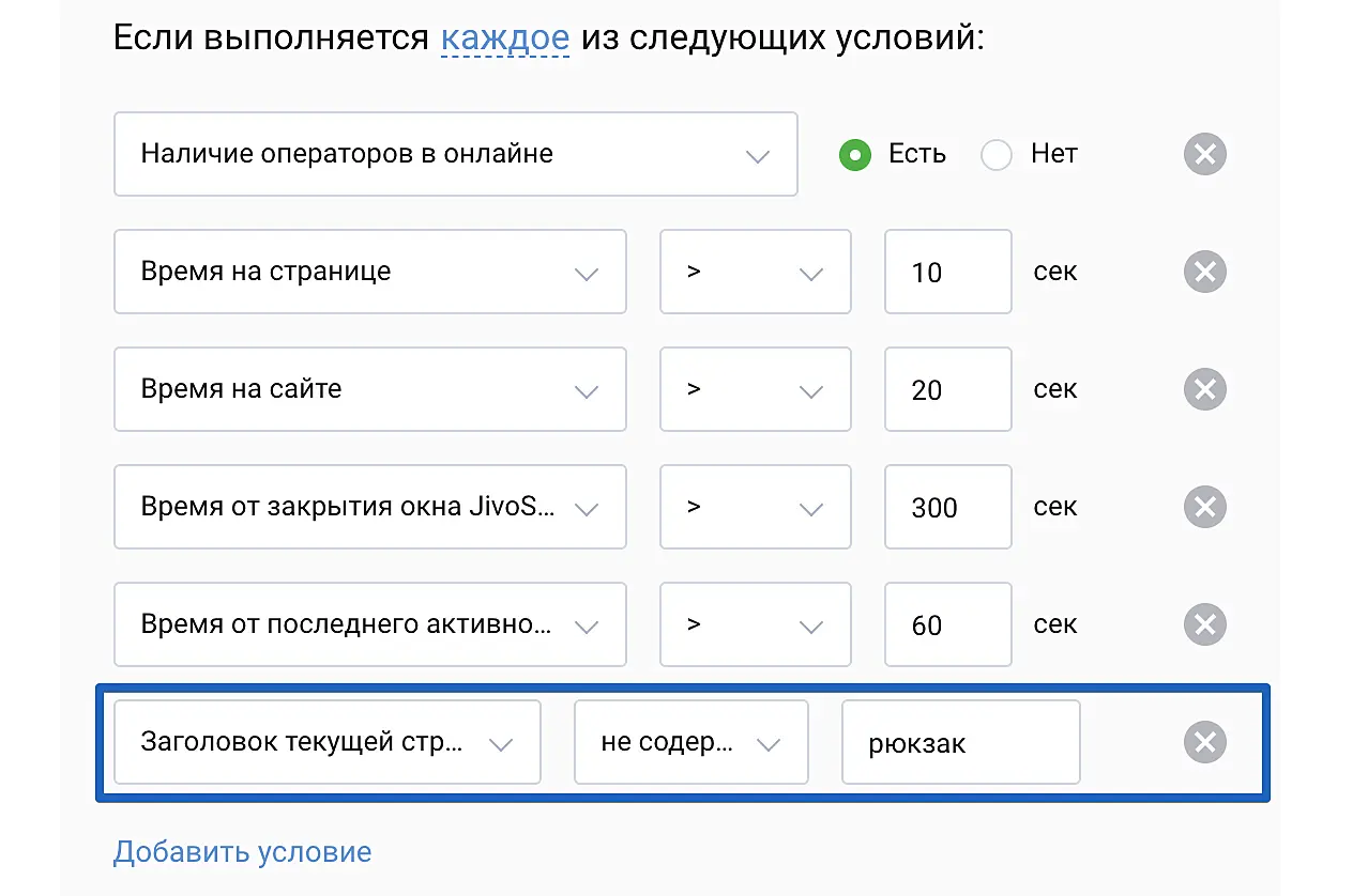 - Первое условие, обязательное, "Наличие операторов в онлайне": "Есть". Это позволяет разделять условия, предназначенные для времени, когда операторы онлайн, от условий для оффлайн-формы.