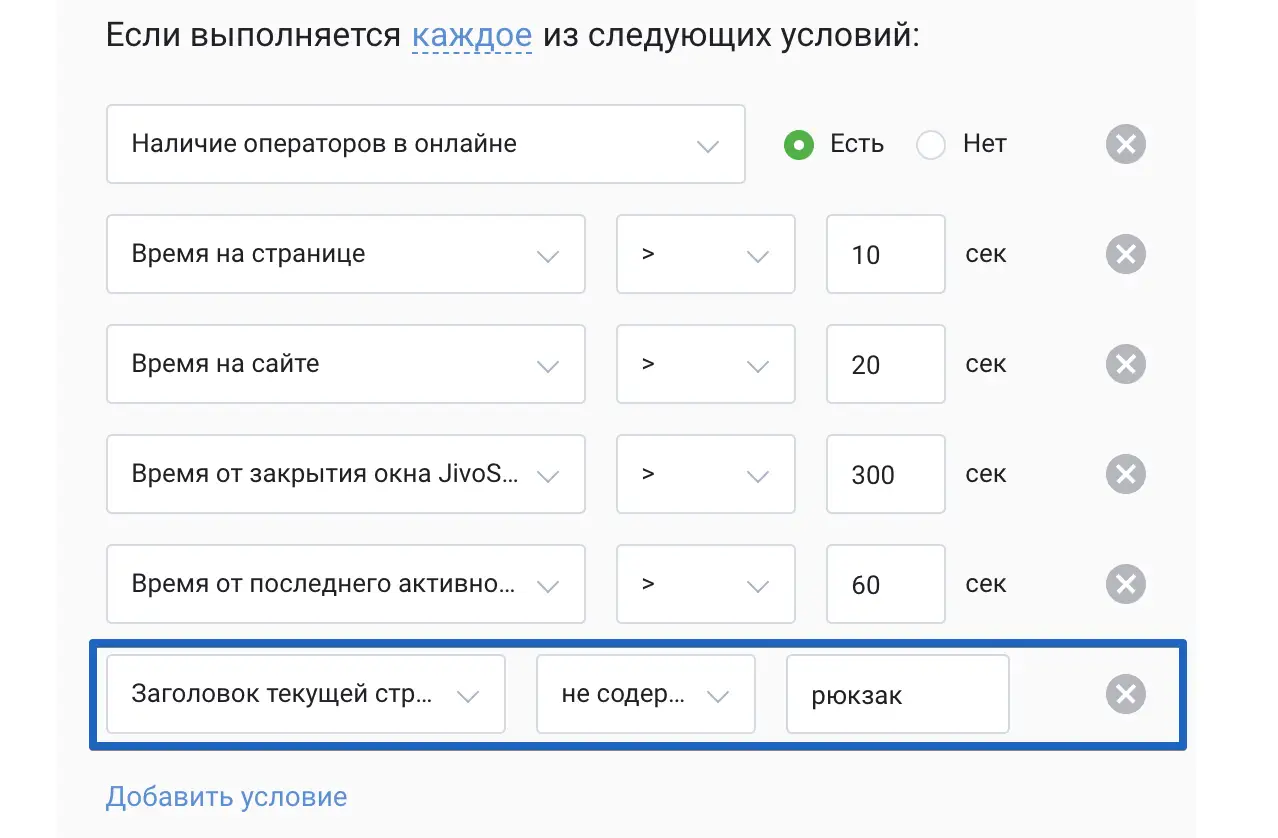 - И самое главное условие, чтобы сработало приглашение - наличие нужного нам слова в заголовке страницы. Например, "рюкзак". Условие выглядит так: Если "Заголовок текущей страницы" содержит "рюкзак", то действие выполнится на этой странице.
