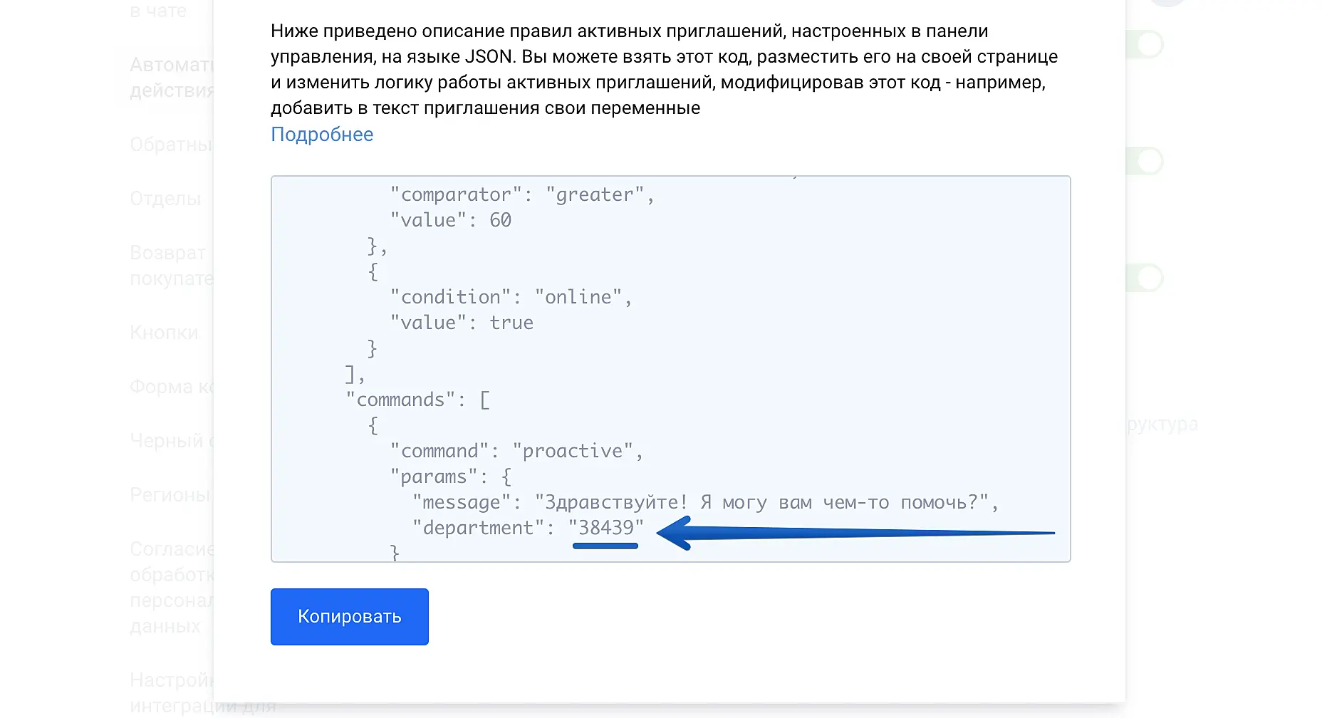 Выяснить id отдела не так уж просто, но возможно. Для этого нужно в настройках сайта, в разделе "Отделы" включить опцию "Выбор отдела перед началом чата" и назначить нужных операторов в отделы. Сохранив настройки отделов, перейти к настройкам автоматических действий и отредактировать активное приглашение в чат. Со включенной функцией "Отделы" в "Автоматических действиях" при выборе действия "Отправить посетителю сообщение от имени оператора" появляется ещё одна опция - от какого отдела, по умолчанию это "Любой отдел". Меняем на нужный отдел, сохраняем и внизу всех настроек справа от кнопки "Вернуть настройки по умолчанию" есть кнопка "JSON-структура". Нажимаем на неё и видим такой код: