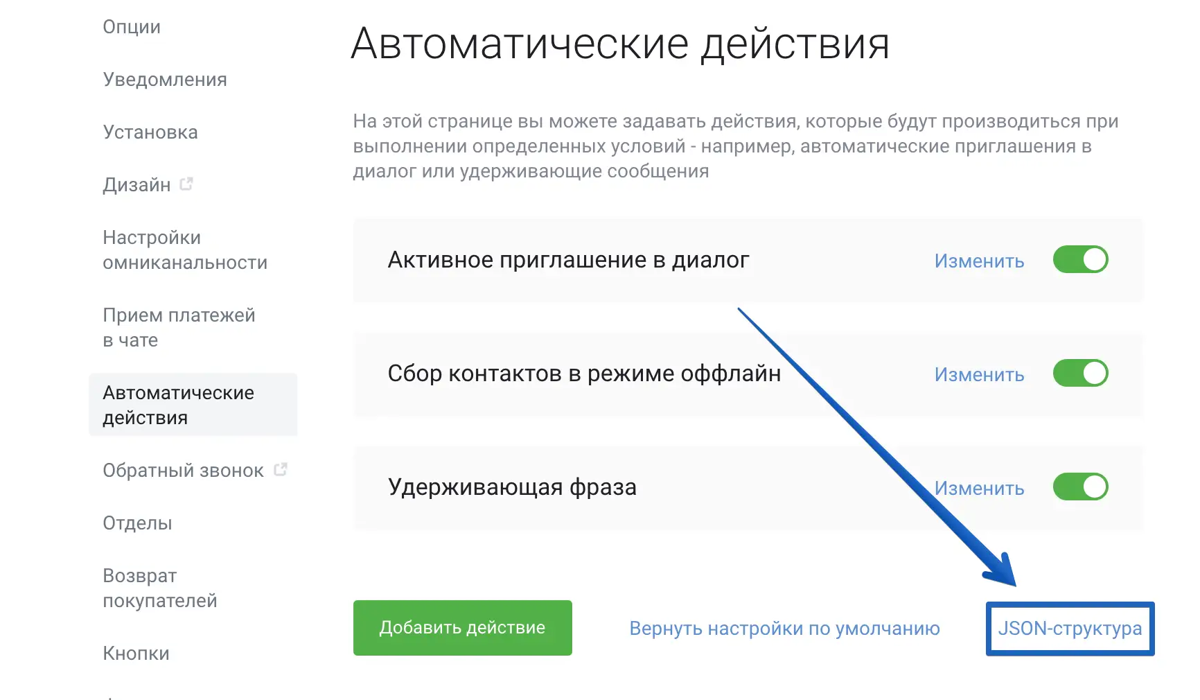 В эту функцию нужно передать JSON-структуру со списком условий и действий. Саму структуру можно взять в приложении Jivo > "Управление" > "Каналы связи" > "Настройки (нужного сайта)" > "Автоматические действия".