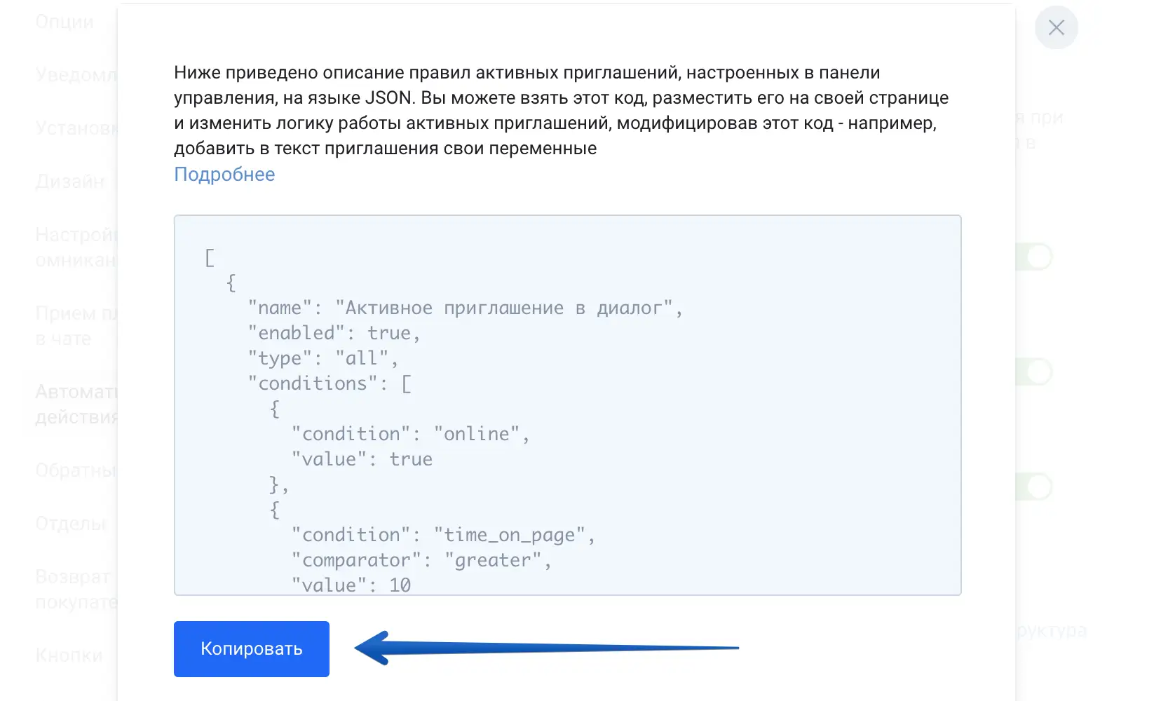 Эта функция устанавливает список условий и действий, как если бы они были настроены через интерфейс в нашем приложении, но с возможностью добавить свою переменную в текст приглашения или в условия. Это может быть нужно для того, чтобы не писать собственные алгоритмы, отсчитывающие время пользователя на странице, на сайте, от последнего приглашения и т.п., чтобы виджет сам проверял эти условия и в заданный момент отображал приглашение с произвольным текстом.
