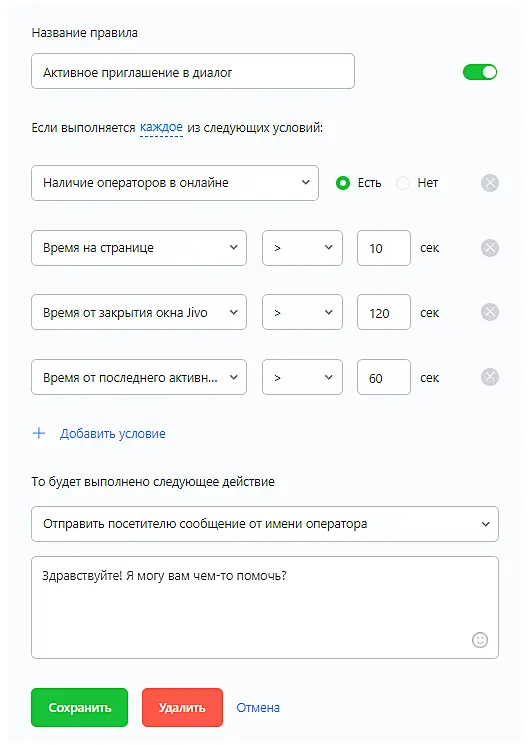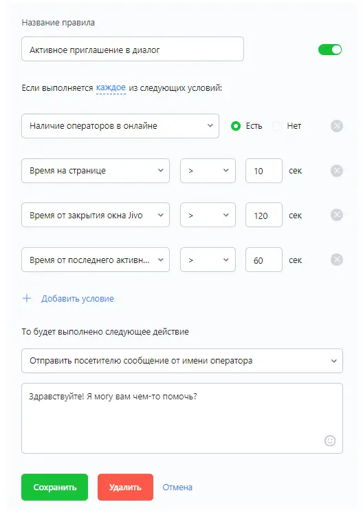 Отправить посетителю сообщение от имени оператора: Основное автоматическое действие, которое позволяет отправлять приглашения в чат каждому посетителю от имени оператора. Обязательное условие для данного результатива: Наличие оператора в онлайне – Да.