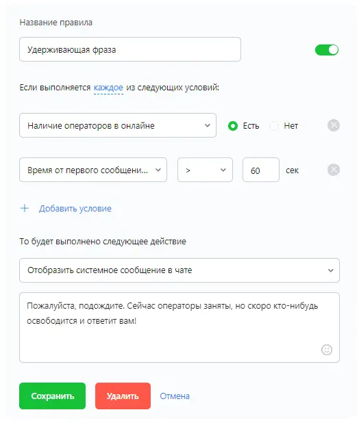 Время от первого сообщения посетителя: Задает время появления сообщения в чате, если оператор не принял диалог. Условие работает для результатива «Отобразить системное сообщение в чате». Другие результативы не поддерживает.