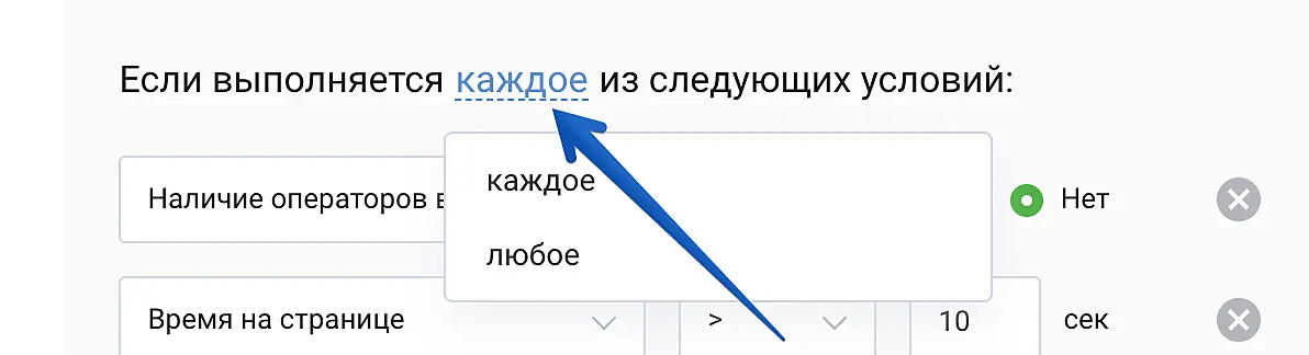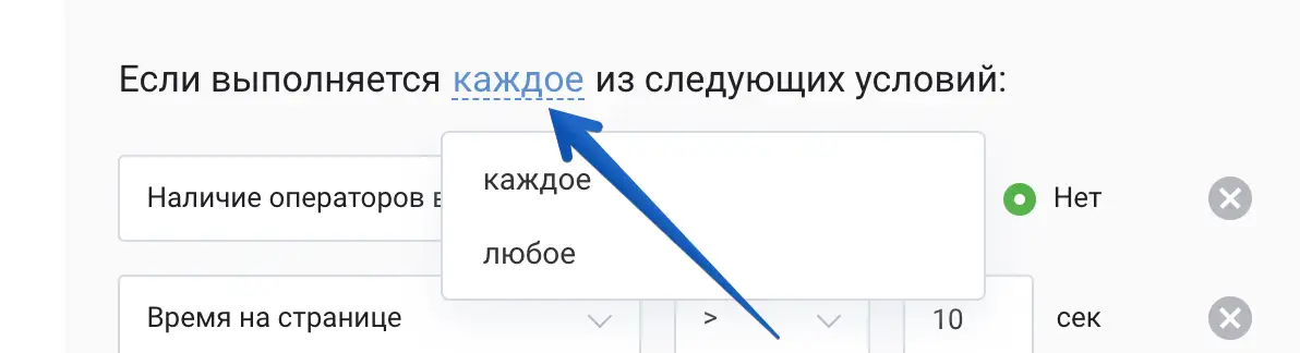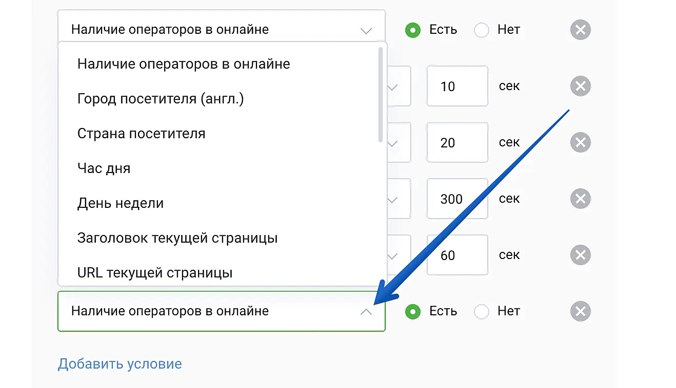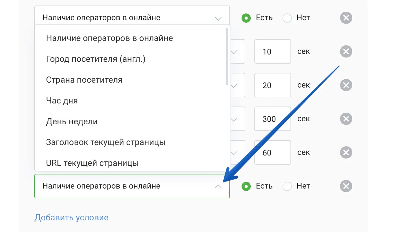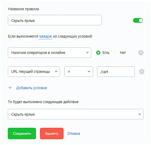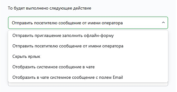 Наличие оператора в онлайне: Данный параметр является обязательным при установке автоматических действий, так как определяет режим работы чата (онлайн, офлайн). Исключением является результатив «скрыть ярлык», где возможны правила без этого условия.