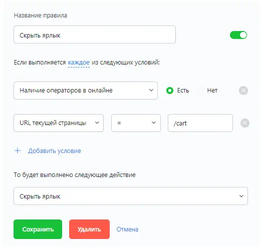 Подробнее о скрытии ярлыка на определенных страницах мы рассказали в инструкции "Как скрыть чат на определенных страницах с помощью автоматических действий"