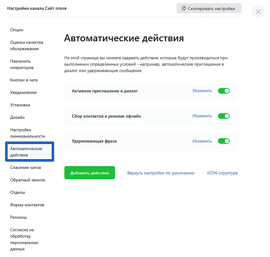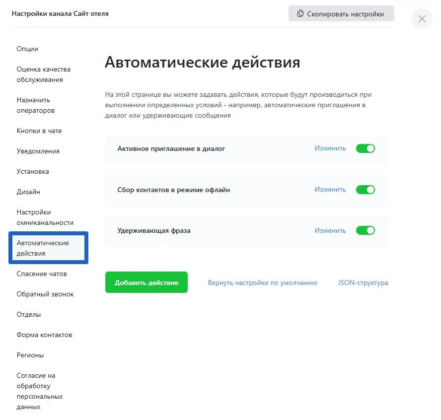 Наш чат способен выполнять автоматические действия при выполнении определённых условий. Чтобы их настроить, нужно войти в приложение Jivo, затем зайти в "Управление" > "Каналы связи" > "Настройки" (канала для нужного сайта) > "Автоматические действия".