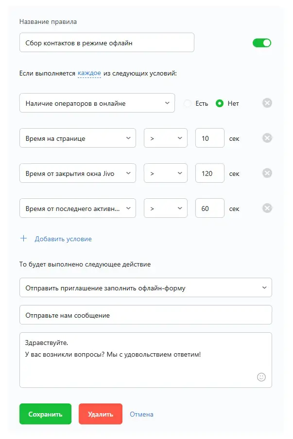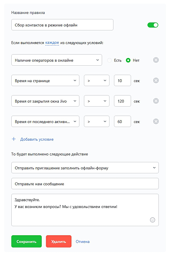 Отправить приглашение заполнить офлайн-форму (генератор лидов): Автоматически открывает офлайн-форму, где посетитель может оставить свое сообщение и контактные данные, которые отправятся на адрес для уведомлений. Обязательное условие для данного результатива: Наличие оператора в онлайне – Нет!