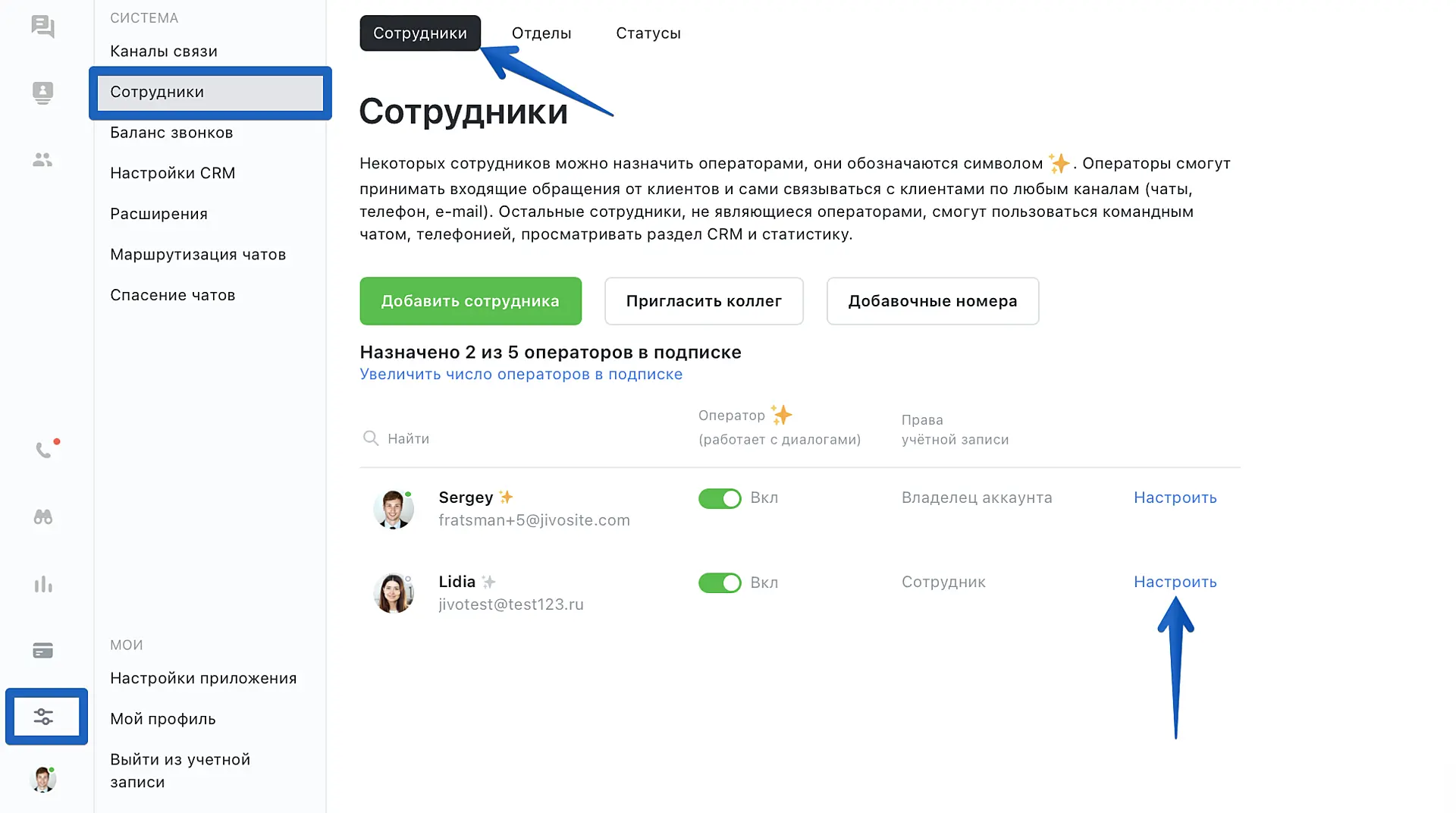 Чтобы изменить настройки сотрудника, откройте приложение Jivo под учетной записью администратора и перейдите в Управление > Сотрудники.