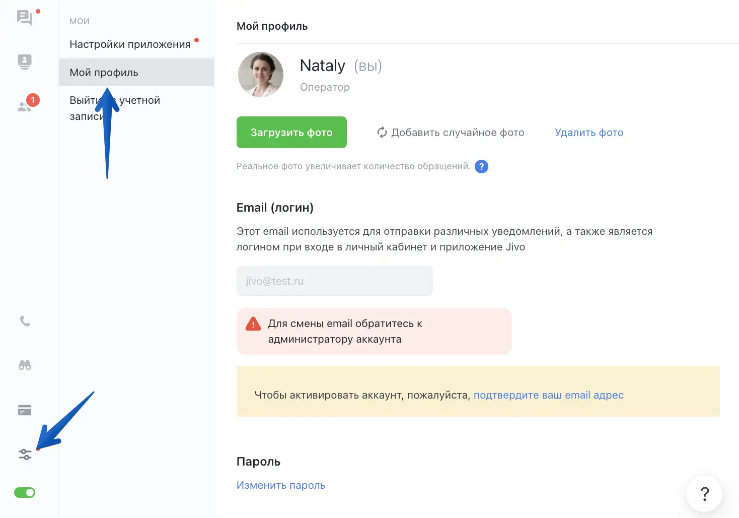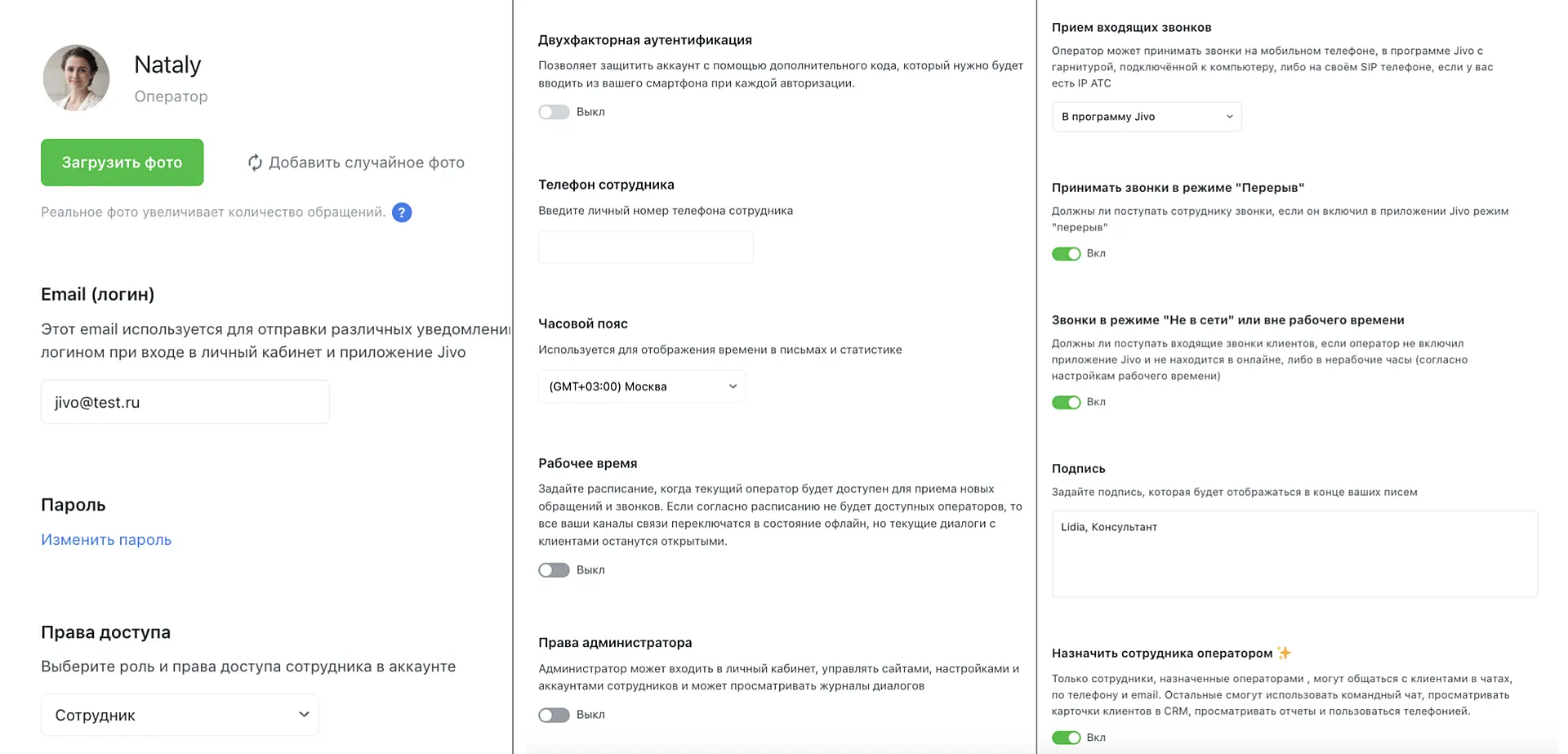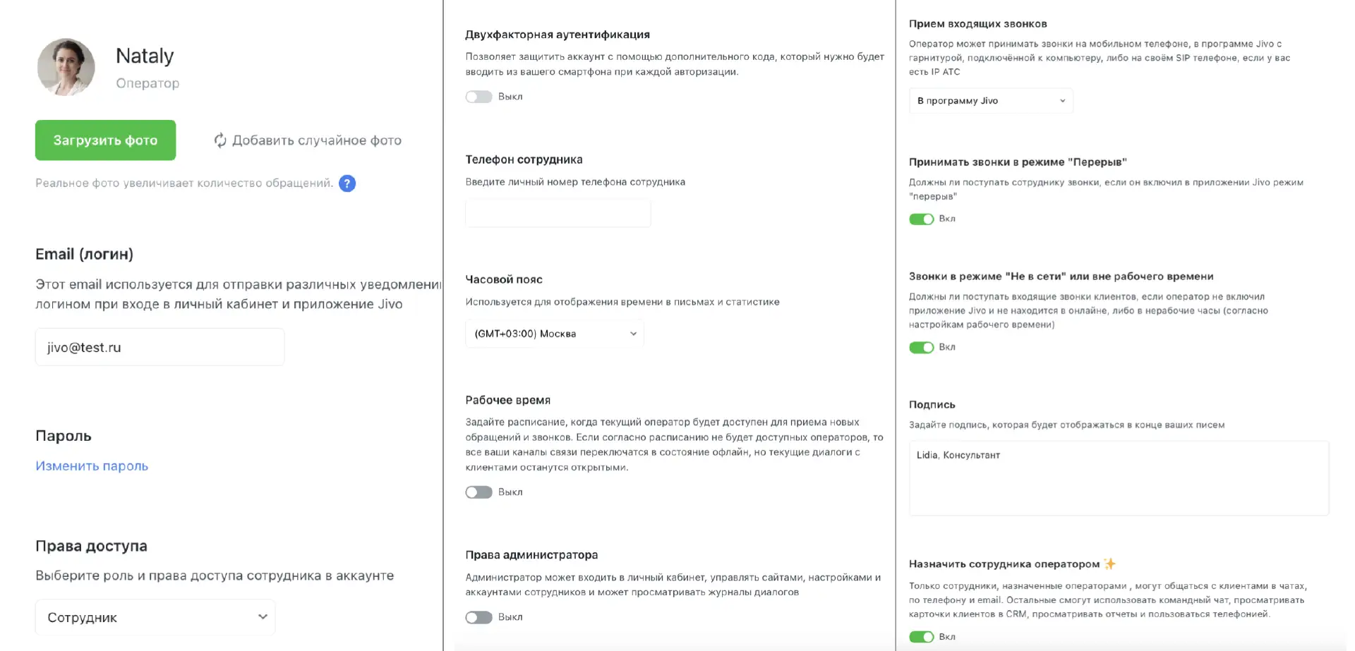 Администраторы аккаунта могут менять все настройки профилей сотрудников. Сотрудники без прав администратора имеют возможность редактировать некоторые настройки своего профиля. Узнать больше про роли сотрудников можно из статьи "Команда и роли сотрудников в Jivo".