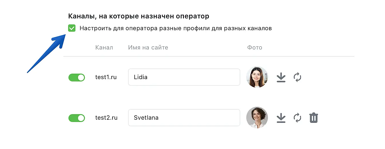 Вы можете настроить разные имена и загрузить разные фото для каждого из сайтов. Для этого включите опцию "Настроить для оператора разные профили для разных каналов".