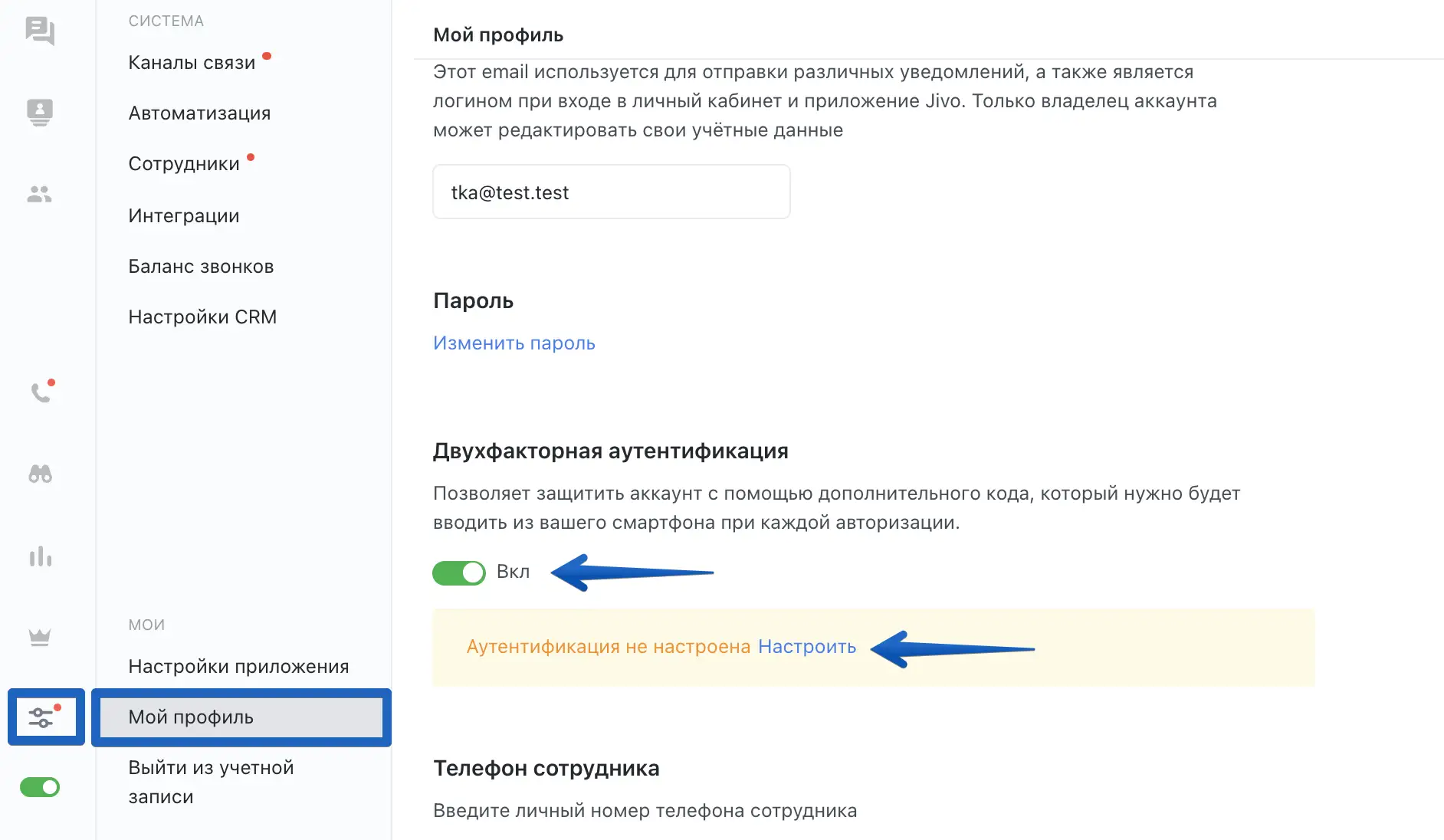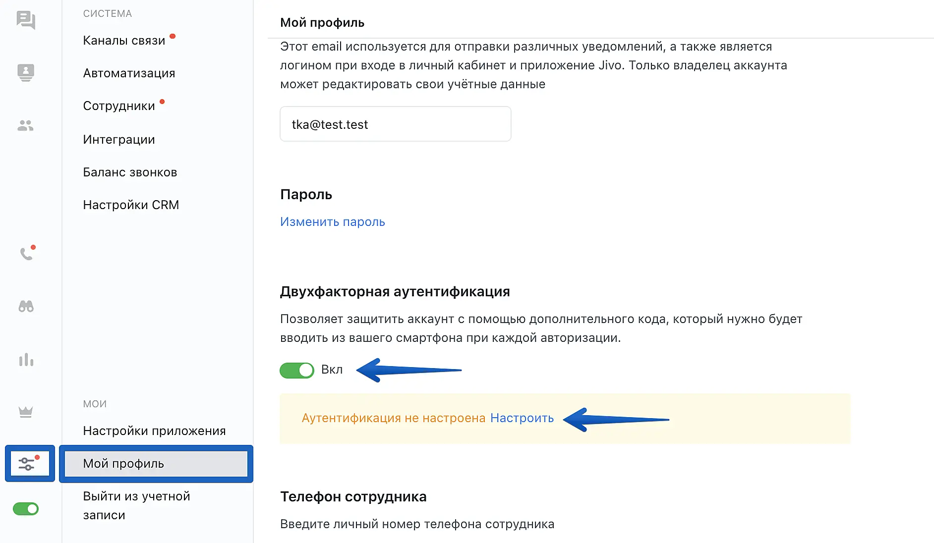 В приложении Jivo перейдите в "Управление" > "Мой профиль", включите "Двухфакторную аутентификацию" и нажмите "Настроить".