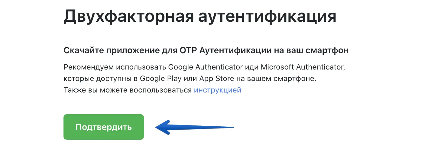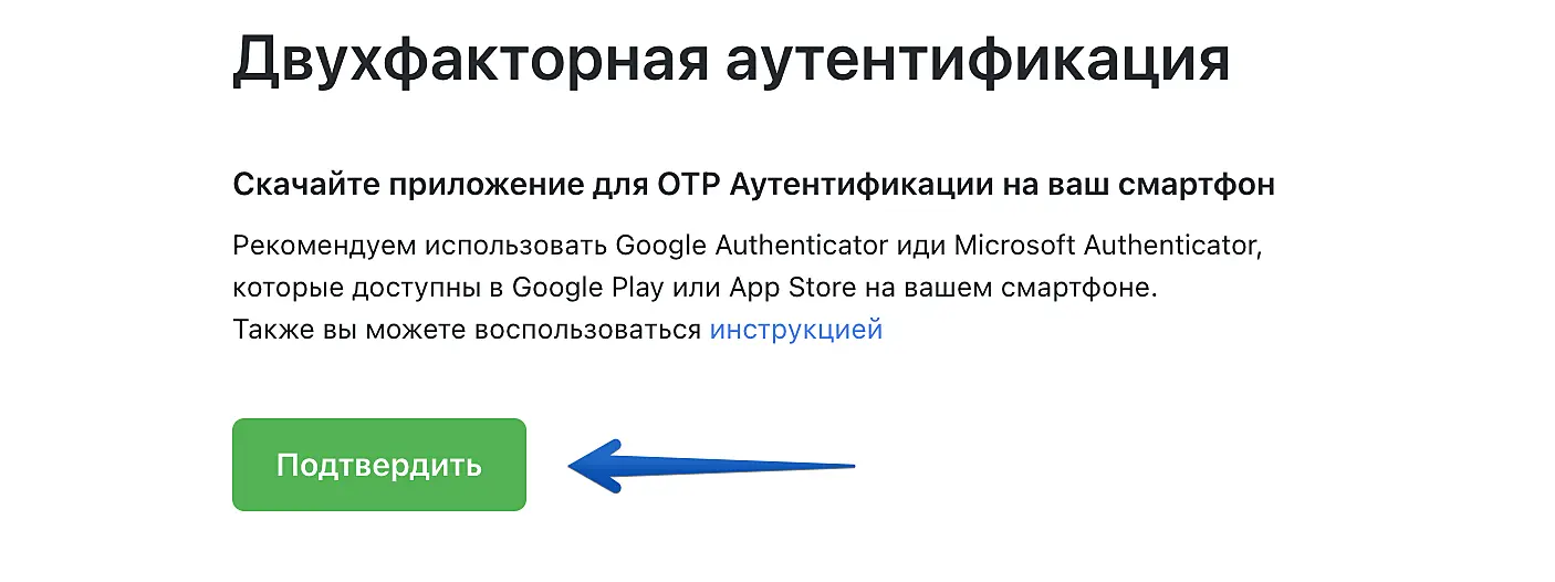 На следующем шаге система попросит вас скачать приложение для OTP Аутентификации. Мы рекомендуем использовать Google Authenticator или Microsoft Authenticator. Такое приложение вы можете найти в AppStore или GooglePlay самостоятельно, либо перейти по ссылкам ниже: