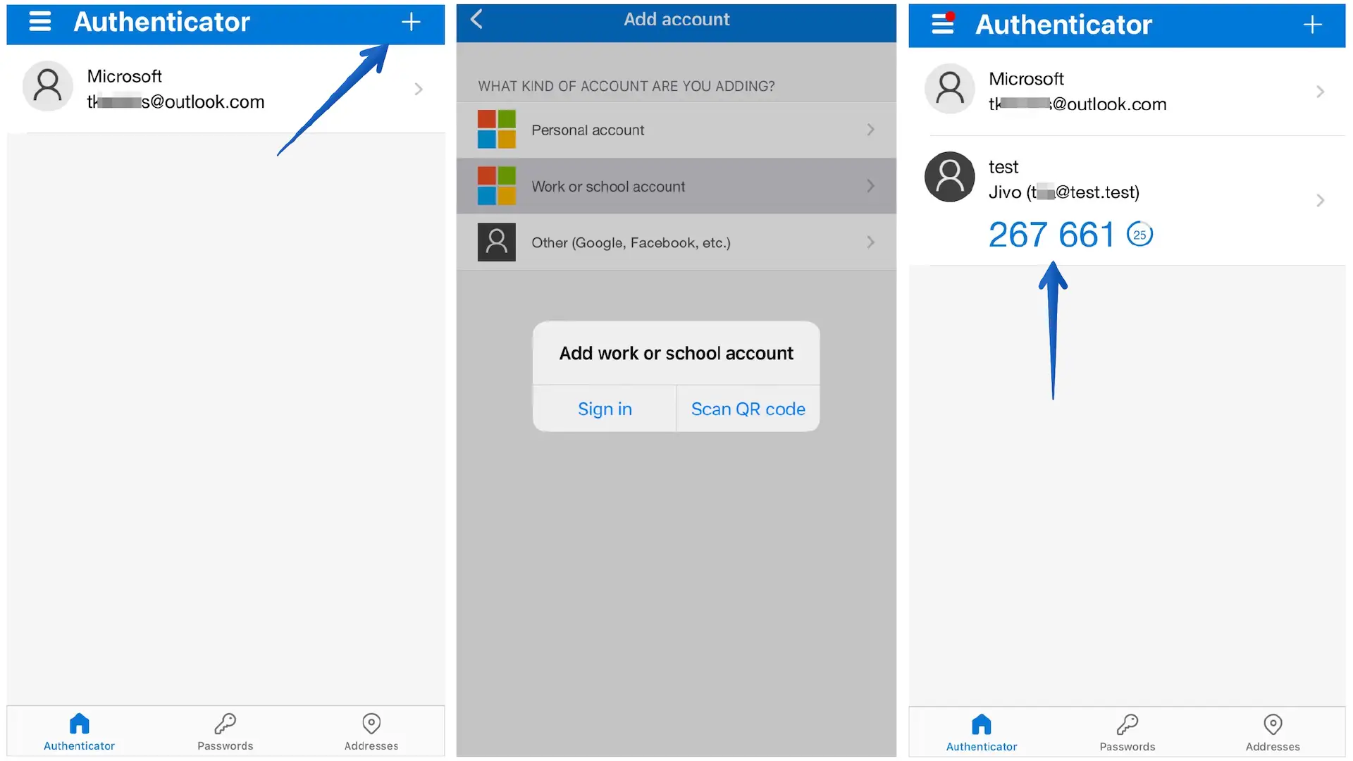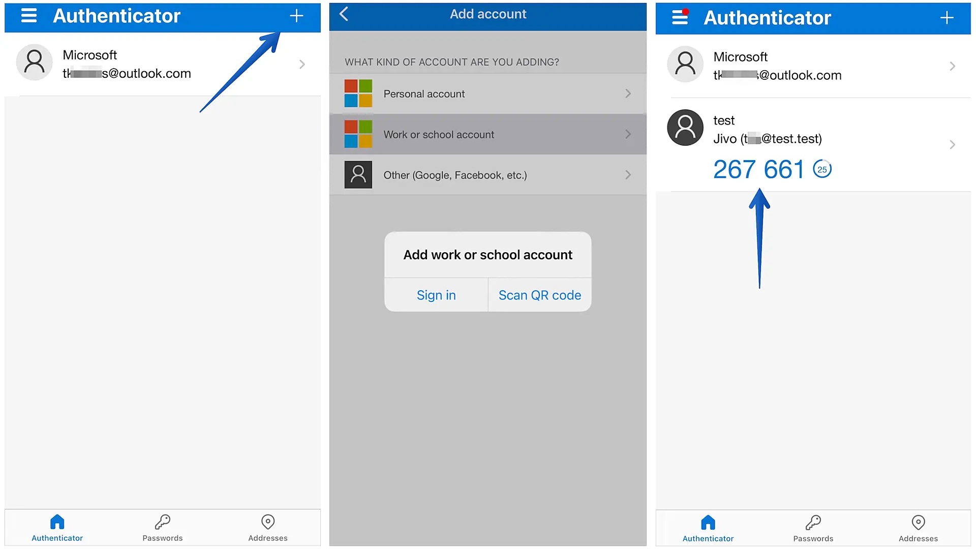 Далее нужно будет добавить новый аутентификатор. В Microsoft Authenticator, например, это делается следующим образом: нужно нажать на "+" в правом верхнем углу, затем выбрать соответствующий тип аккаунта и отсканировать QR-код на экране, после чего вы увидите сгенерированный код, который будет обновляться каждые 30 секунд. Его нужно использовать в рамках периода действия.