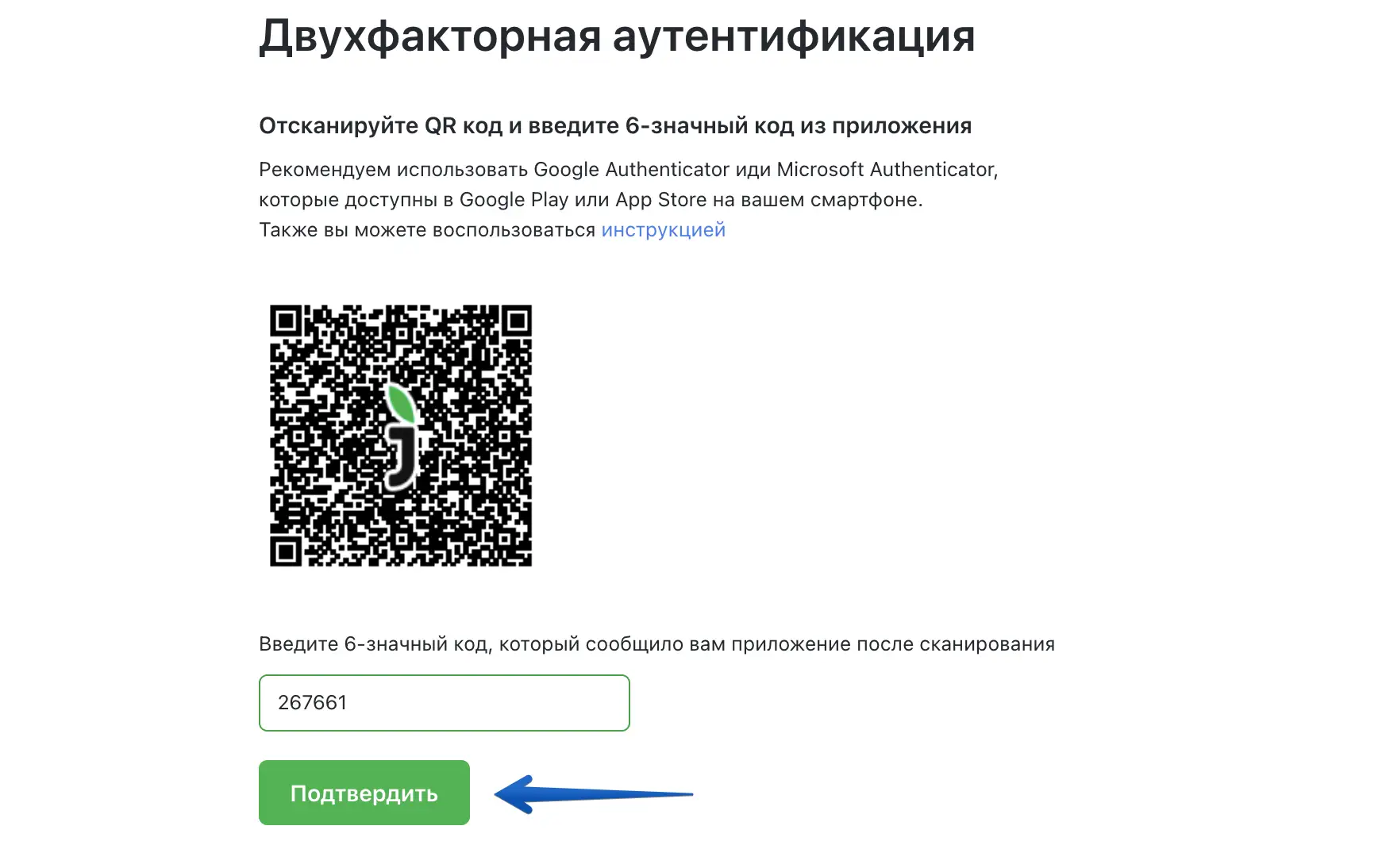 Введите код из аутентификатора и нажмите "Подтвердить".