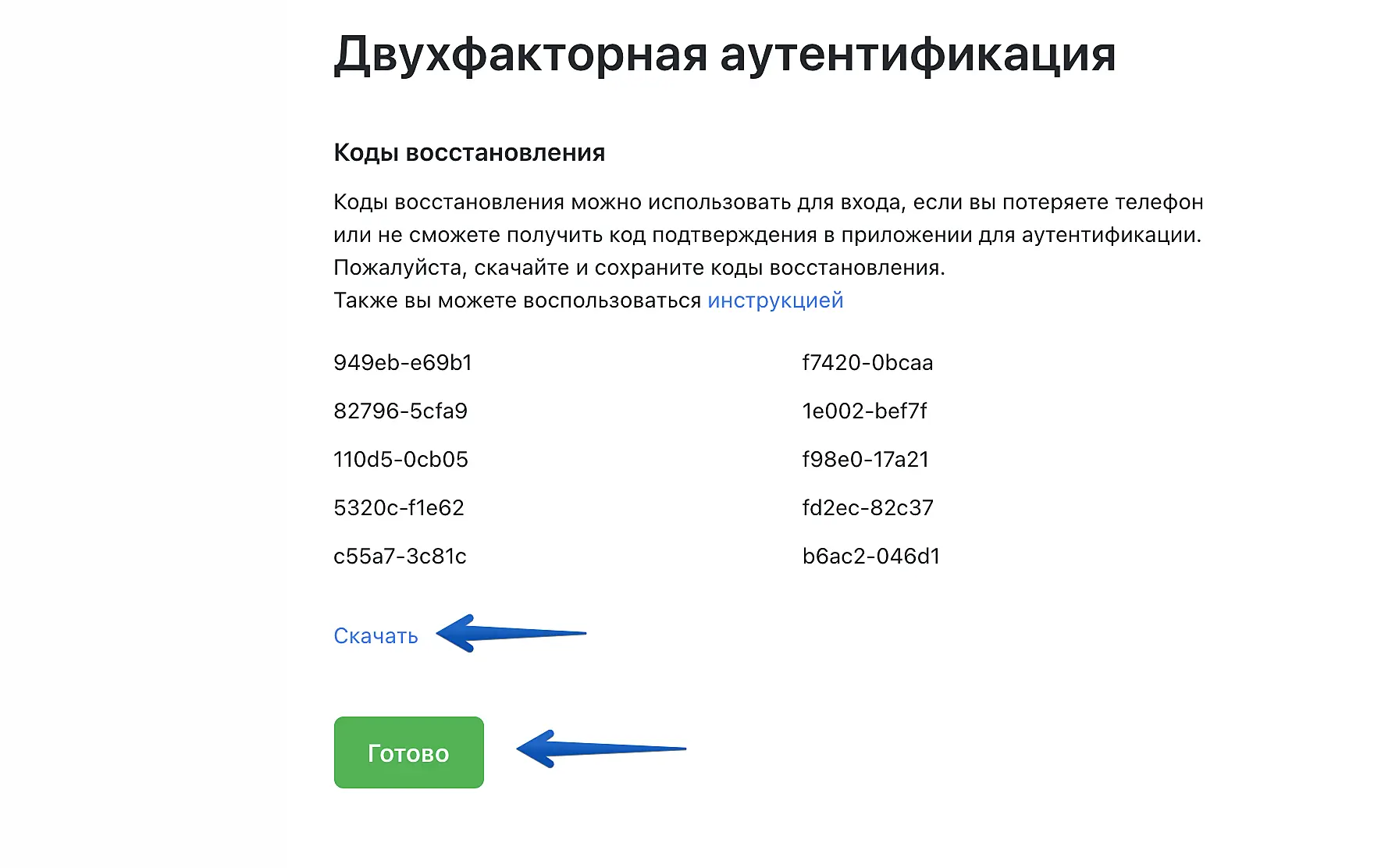 После этого вы получите список одноразовых кодов, которые нужно сохранить. Их можно использовать в случаях, когда, по какой-то причине, к аутентификатору нет доступа.