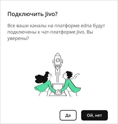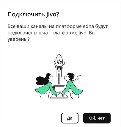 Подтвердите подключение всех каналов к чат-платформе Jivo. Если у вас несколько активных каналов и вы хотите подключить только один из них, то нажмите "Ой, нет" и напишите запрос в техническую поддержку Edna support@edna.ru.