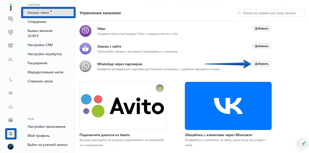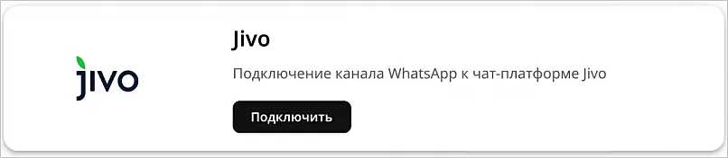 Для этого откройте приложение Jivo, раздел "Управление" > "Добавить канал" > "WhatsApp через партнеров".