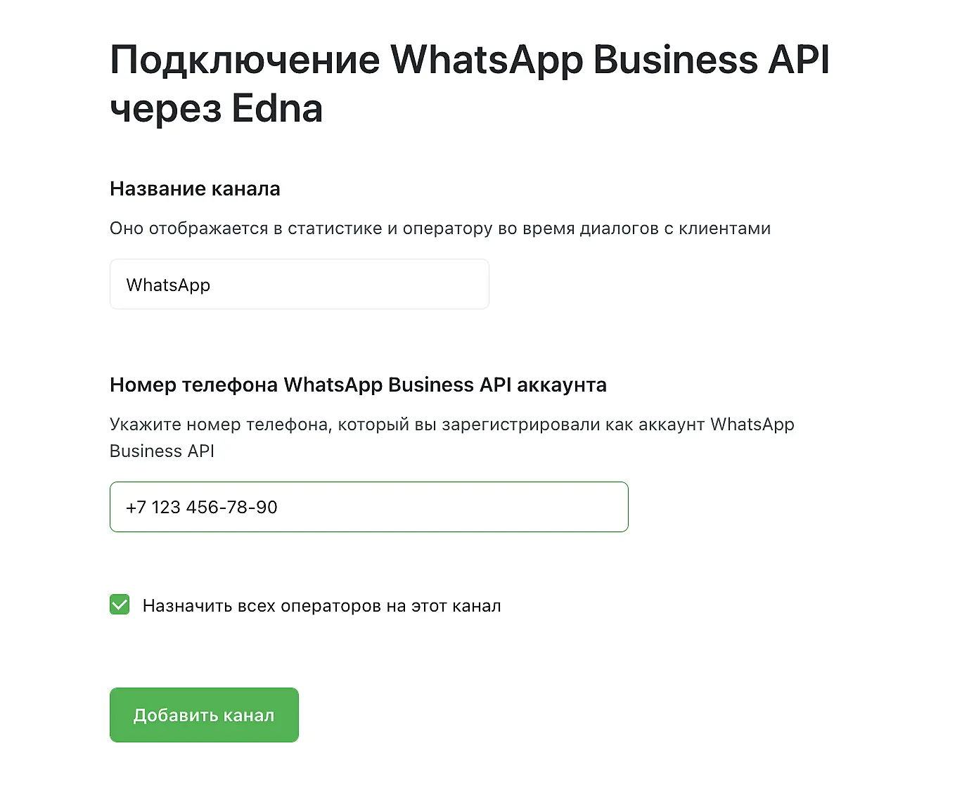 На экране подключения укажите название канала и введите номер телефона, который был зарегистрирован как аккаунт WhatsApp Business API: