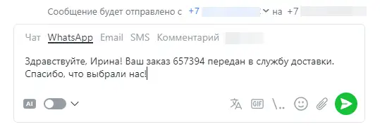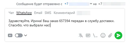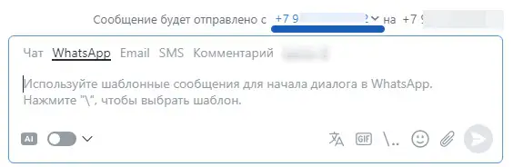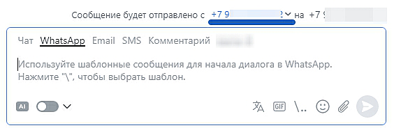 После подключения интеграции с WhatsApp во чате появится еще один тип поля ввода: WhatsApp. Переключившись на него, вы сможете отправить исходящее Шаблонное сообщение клиенту (при условии, что в информации о клиенте указан номер телефона). Если у вас подключено несколько номеров WhatsApp, выберите, с какого номера будет отправлено сообщение: