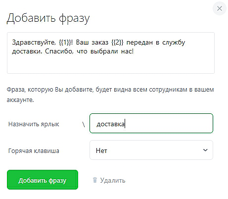 Скопируйте фразу из Edna и вставьте ее в Jivo в неизменном виде, пропишите ярлык, который поможет вам ее быстро отыскать в дальнейшем, по желанию установите сочетание клавиш для моментальной отправки фразы и нажмите на "Добавить фразу".