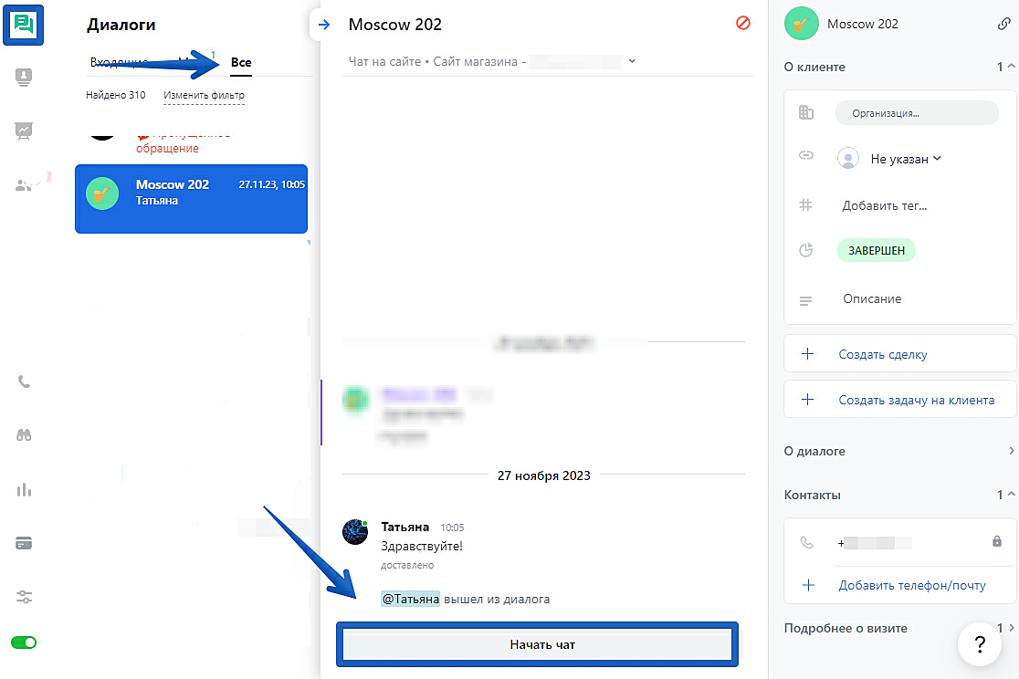 Откройте приложение Jivo и перейдите в любой чат, либо откройте один из архивных ("Диалоги" > "Все" > "Начать чат"):