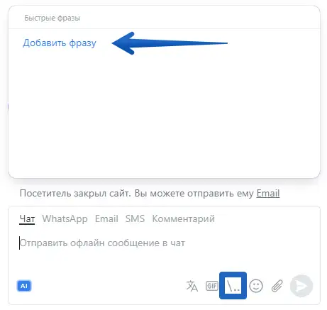 Нажмите на иконку \.. снизу поля ввода текста и в окне добавления быстрых фраз выберите "Добавить фразу":