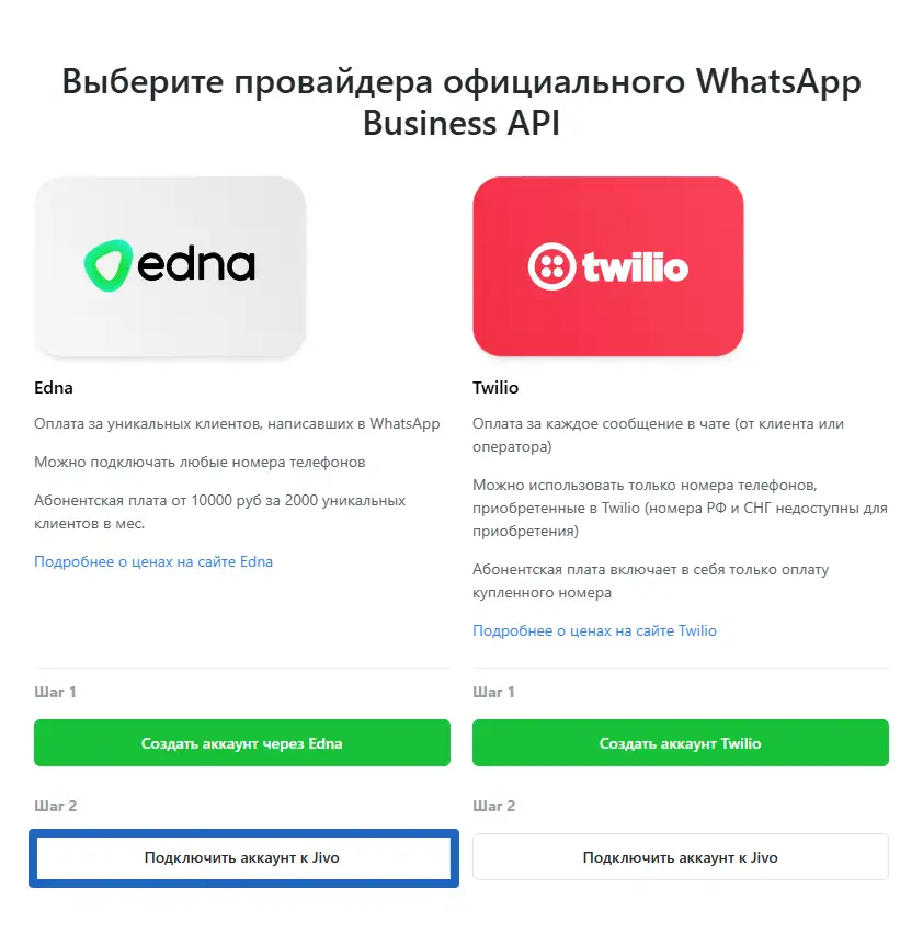 В появившемся окне в блоке Edna нажмите на кнопку "Подключить аккаунт к Jivo":