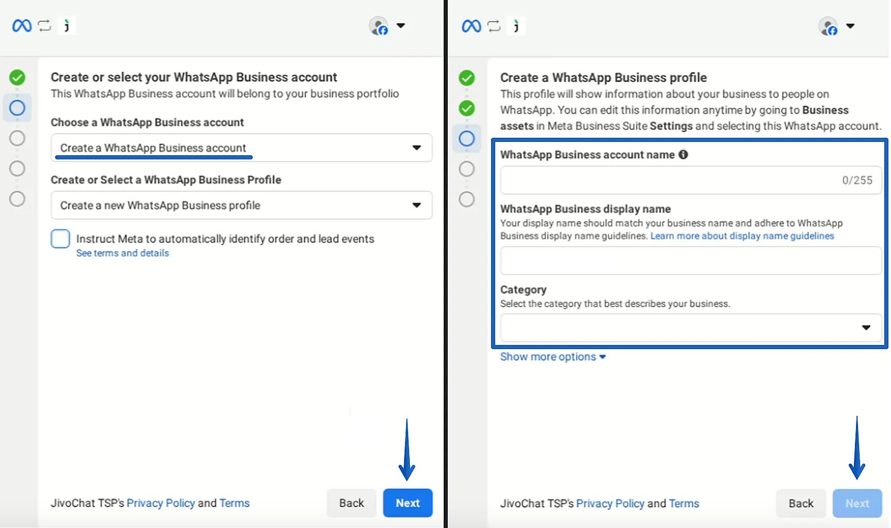 - Далее создайте WhatsApp Business profile, заполнив название Бизнес-аккаунта, отображаемое для клиентов имя, и выбрав категорию вашего бизнеса.